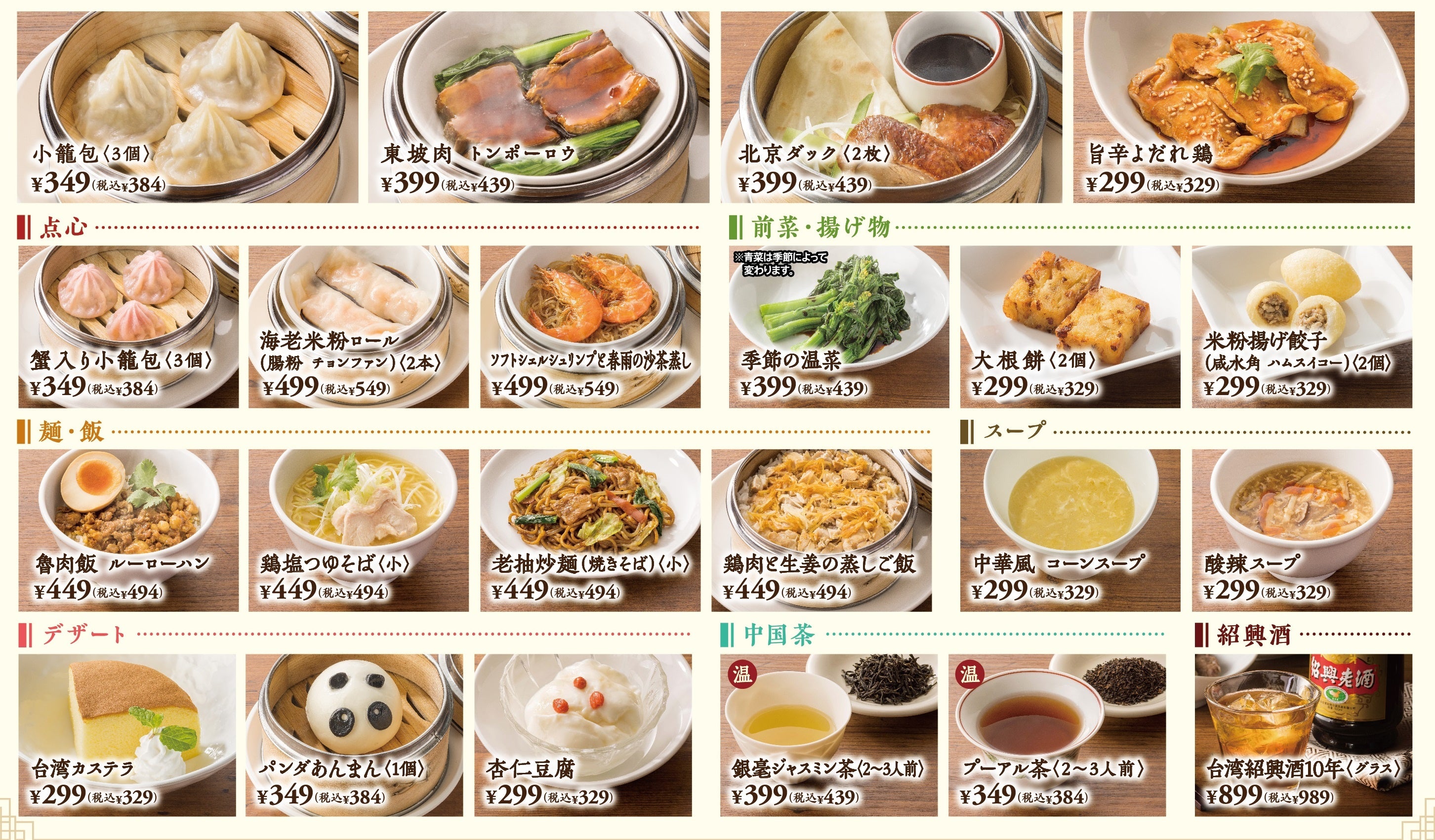 点心など約50種類の料理をご用意し、食べ放題コース、セットメニュー、アラカルトからお選びいただけます。蒸したての自家製小籠包をはじめとする点心類や前菜、揚げ物、麺、飯、スープ、デザートまで1品ずつこだわった商品をご提供いたします。また本格茶葉を厳選した中国茶を複数種類ご用意しています。