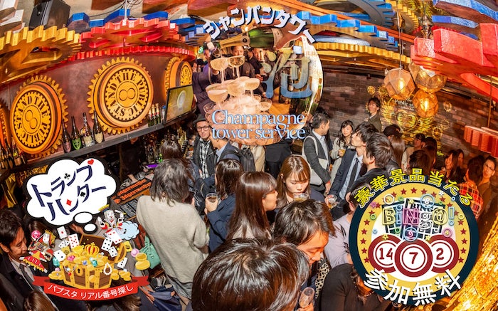 お客様全員で参加するオリジナルBINGO大会をパブスタ全店舗で開催します。無料で飲み放題をご利用いただけるクーポンやボトルやショットなどの高価景品、フードやスナックなど、景品を多数ご用意し多くのお客様に最後まで楽しんでいただける企画です。