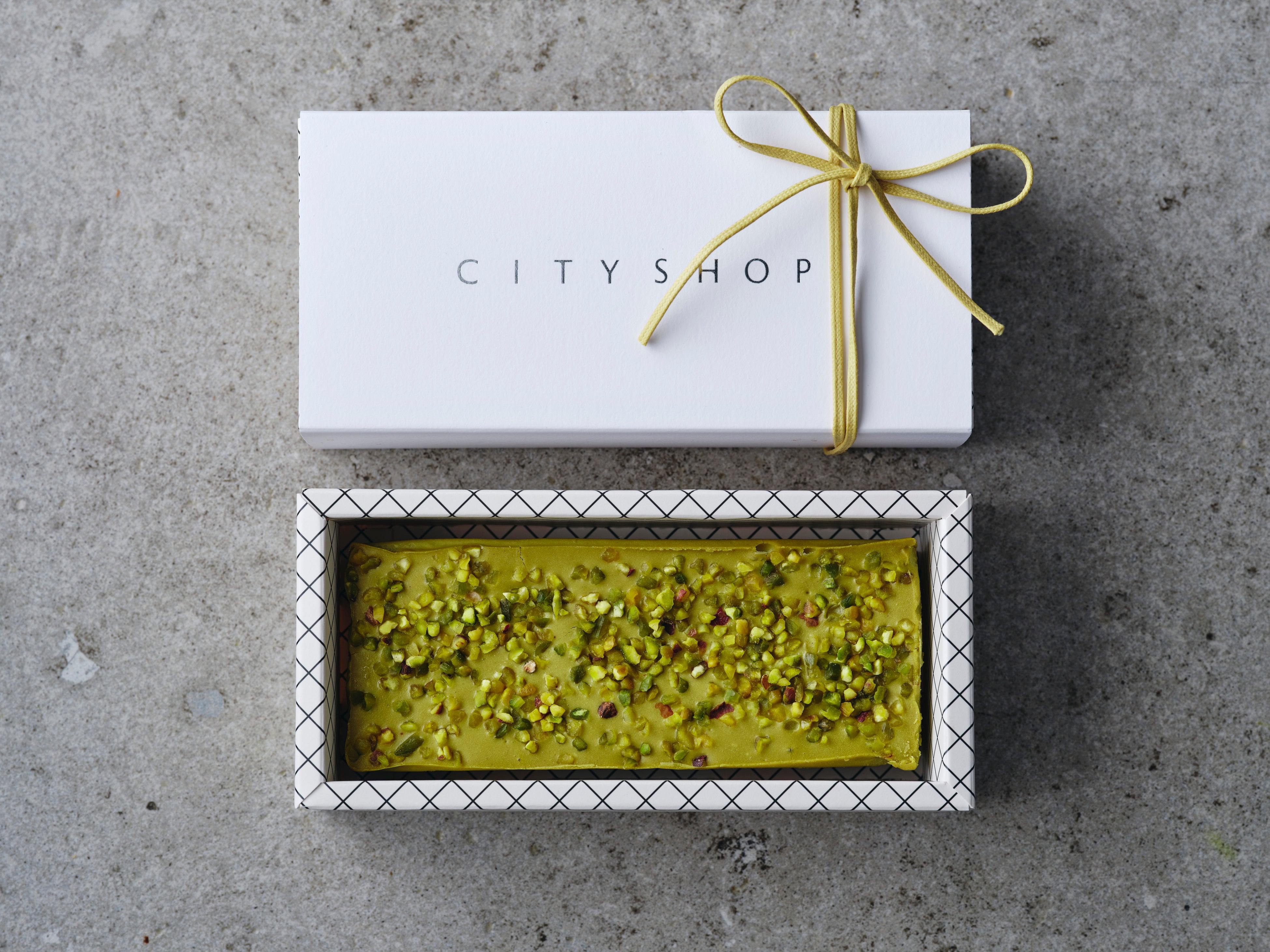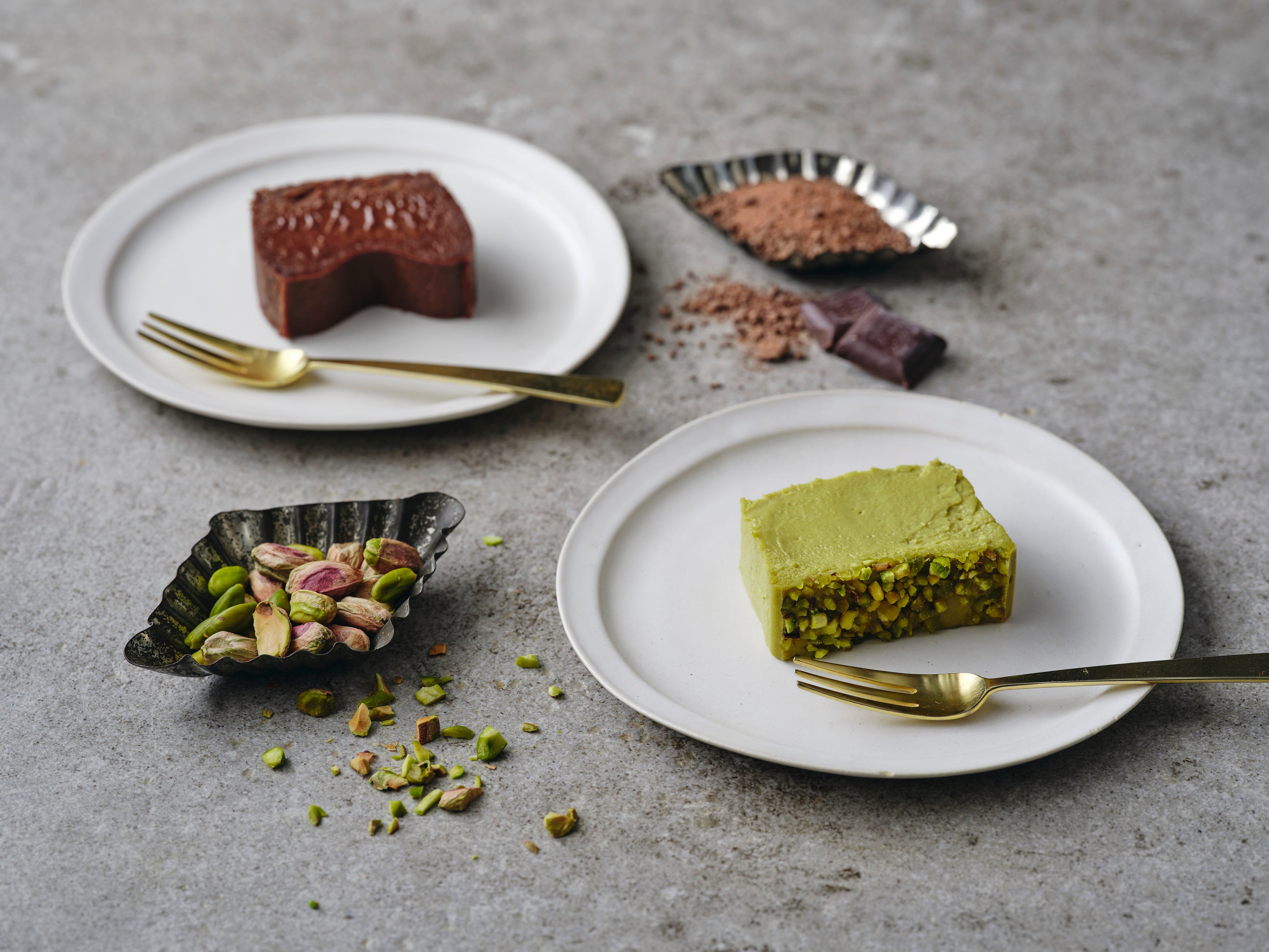 スイーツテリーヌの定番であるチョコレートテリーヌは、カカオ豆からチョコレートになるまでの一連の工程を全て自社ファクトリーで行うBean to Bar(ビーン・トゥ・バー)のサンフランシスコ発チョコレート専門店「ダンデライオン・チョコレート」のグラウンドチョコレートを使用しています。グラウンドチョコレートは、ひとつの原産国/生産地のカカオだけを用いたカカオ分70%のシングルオリジンチョコレートをパウダー状に粉砕したチョコレートです。そのため、カカオそのものの味わいを感じられる「直火焼きチョコレートテリーヌ」となっています。もう1種類は、CITYSHOPのコンセプトである「いろんな野菜を、もっと美味しく、もっとデイリーに食べる」を表した鮮やかな緑色のブランドカラーをイメージした「濃密ピスタチオチーズテリーヌ」です。イタリア産ピスタチオペーストと北海道産クリームチーズを贅沢に使用することにより、ピスタチオの香ばしさと濃厚なコク、クリームチーズの爽やかな酸味とクリーミーな味わいが同時に楽しめる一品です。