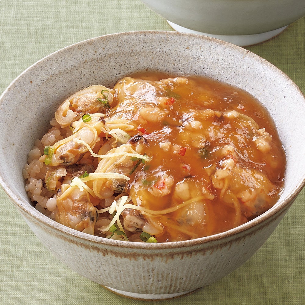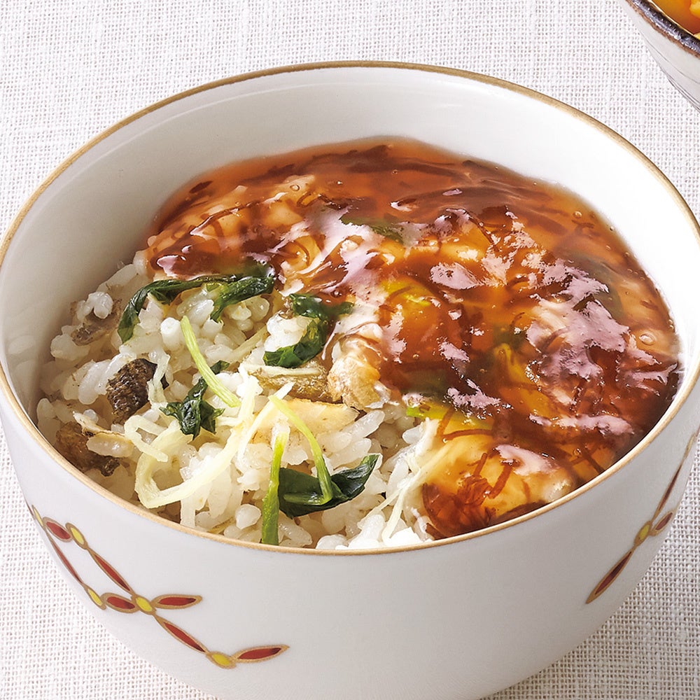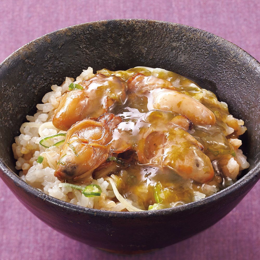 醤油で炊き上げたご飯に、たまり醤油と2種類の酒で味付けした風味豊かな広島県産牡蠣を載せ、贅沢な味わいに仕上げました。香りのよい青葱と針生姜が、味にメリハリを生んでいます。柔らかく舌触りよい海藻・一重草を使った餡は、ぜひサンマや貝柱、白身魚、イカなどの魚介類や、鴨、鶏、豚肉の塩焼きにかけてお召し上がりください。