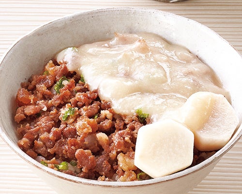国産の豚ひき肉で仕立てた甘辛いそぼろを盛り付け、小口に切った青葱をたっぷりと散らしたご飯は、おろし生姜の風味がきいた繊細な味わいです。鰹と昆布の出汁で炊いた里芋を添えました。餡は、ほんのりと甘い西京味噌で味付けしています。揚げなすや焼きなす、グリルした白身魚、グラタン、ドリアともよく合う餡です。