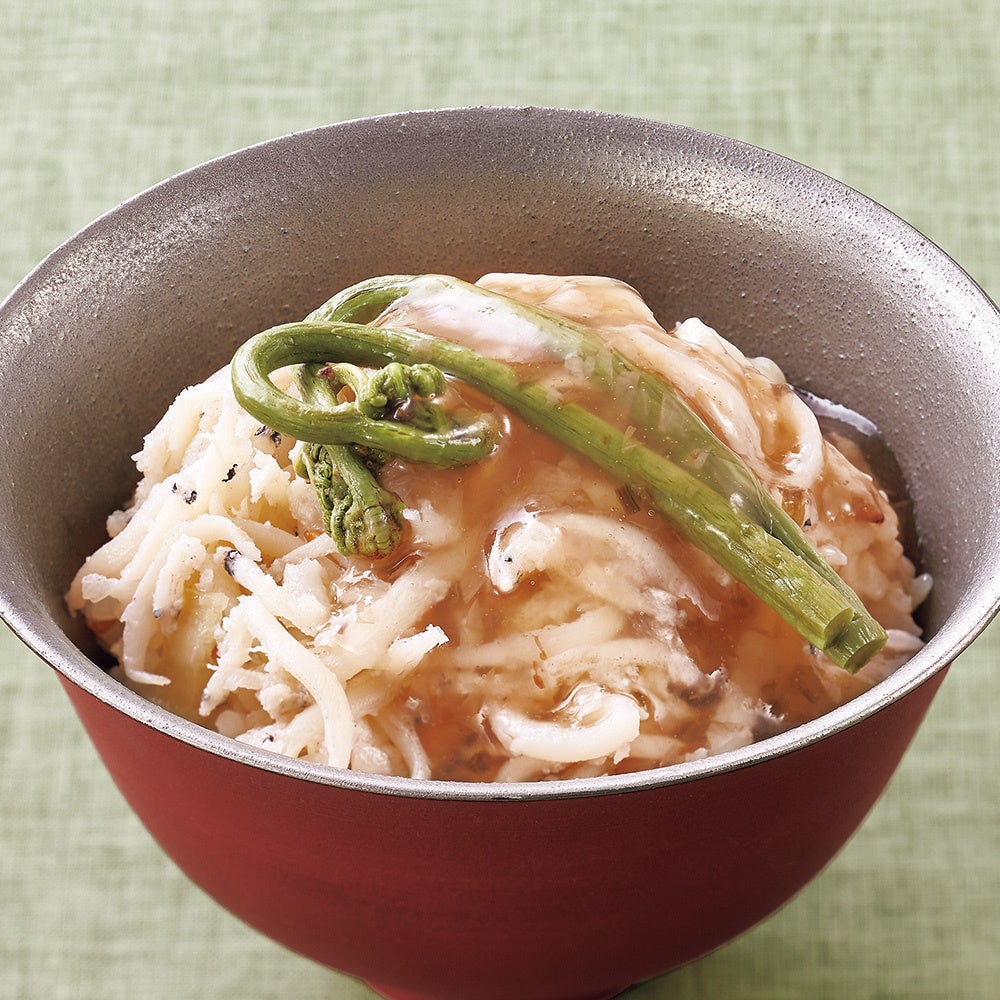 鮎を丁寧に下処理してふっくらと焼いた後、昆布出汁と一緒に炊き上げたご飯です。三つ葉で彩りを添えました。生姜の爽やかな香りと相まって食欲をそそります。和風出汁をきかせたさっぱりとしたもずく餡と一緒にどうぞ。餡はそば、うどん、そうめんなどにかけても楽しめます。
