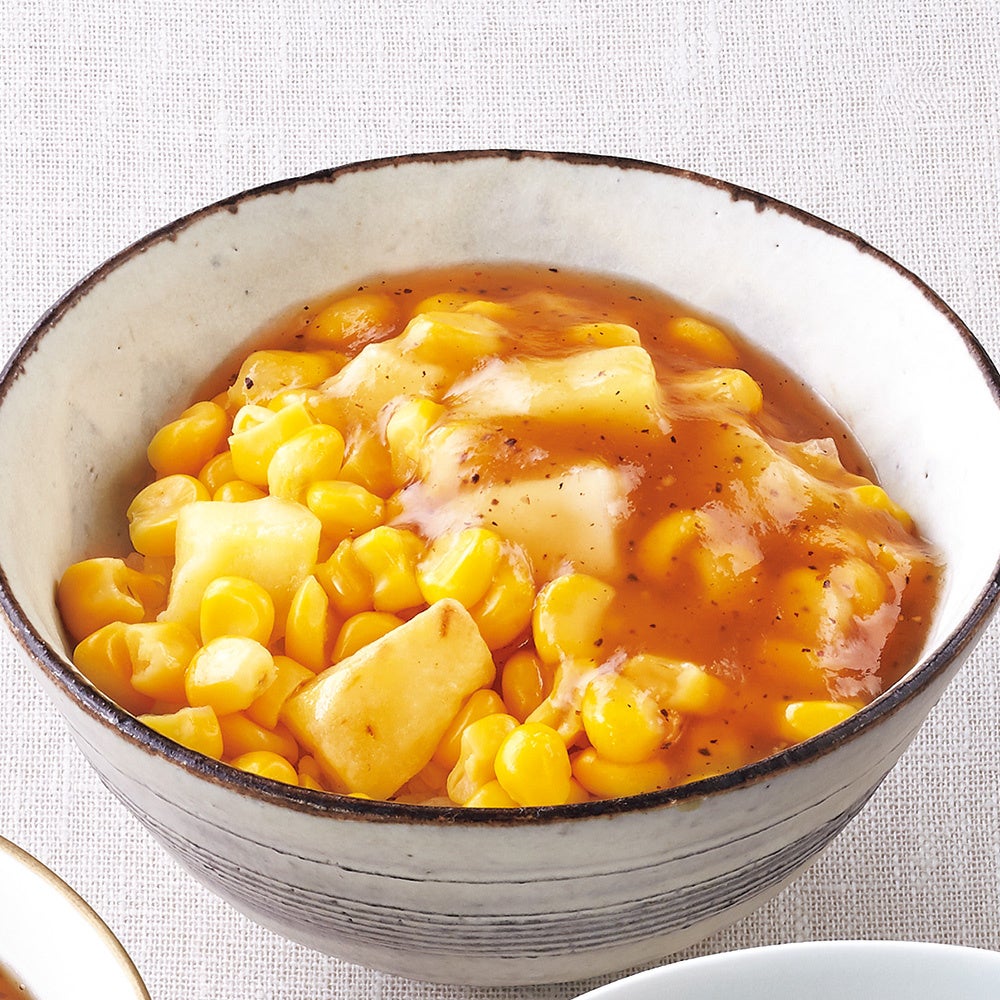 バターで味付けしたご飯に、甘みが豊かなじゃがいもと北海道産とうもろこしを盛り付けました。まずはそのままご飯をお楽しみください。ピリッとした黒胡椒餡を途中でかけると、味わいの印象が変わります。餡はポテトフライや炒めた牛肉や鶏肉、山菜、もやしなどにもピッタリです。