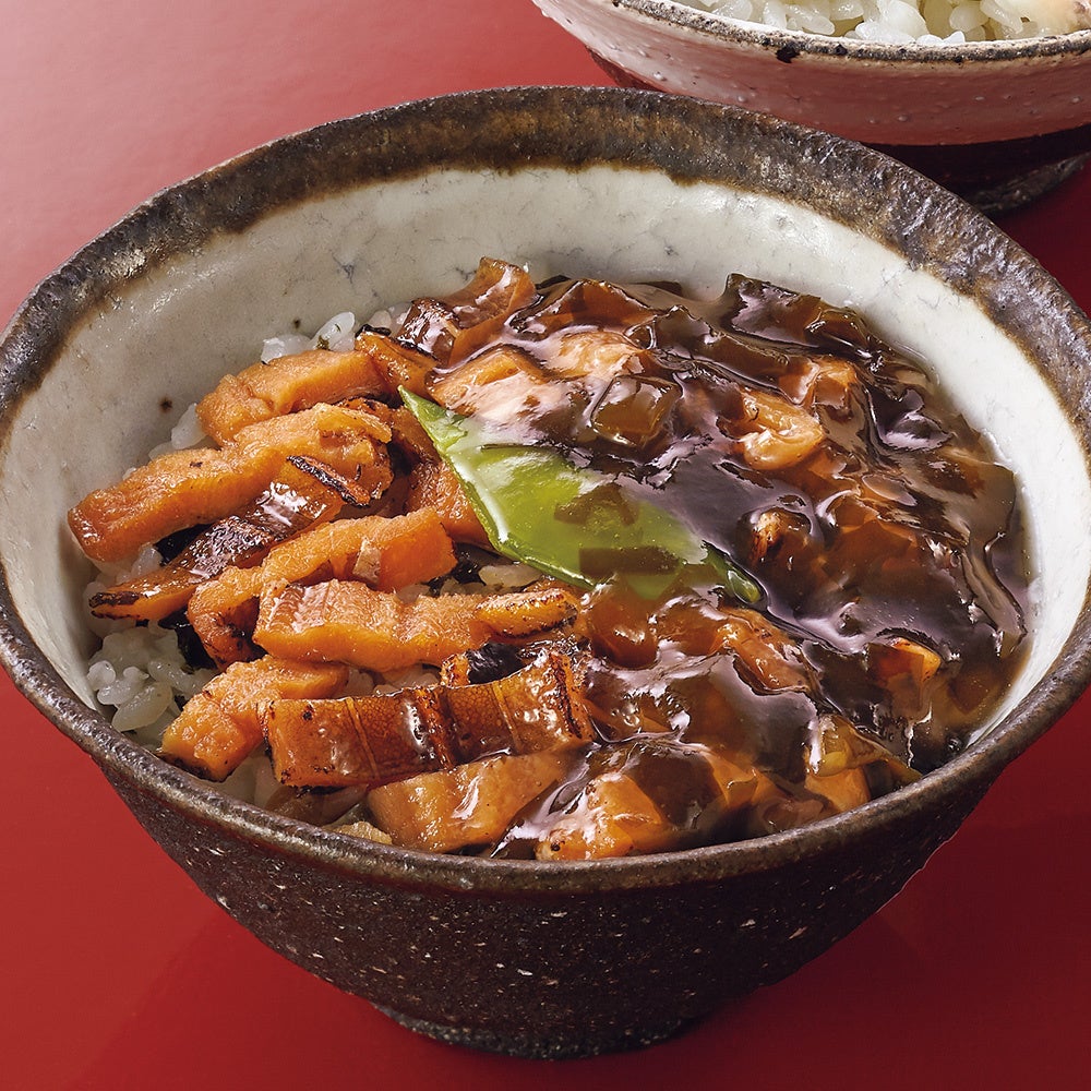 紫蘇梅を混ぜ込んだ爽やかなご飯に焼海苔をしき、香ばしく炙った煮穴子を載せました。紫蘇梅の酸味が味わいを引き締めます。三陸産の若布を使用した餡は、薄口醤油で磯の香りを引き立てました。この餡と相性のよい食材は白身魚。焼く、蒸す、揚げる、どのように調理したものでも美味しく召し上がっていただけます。