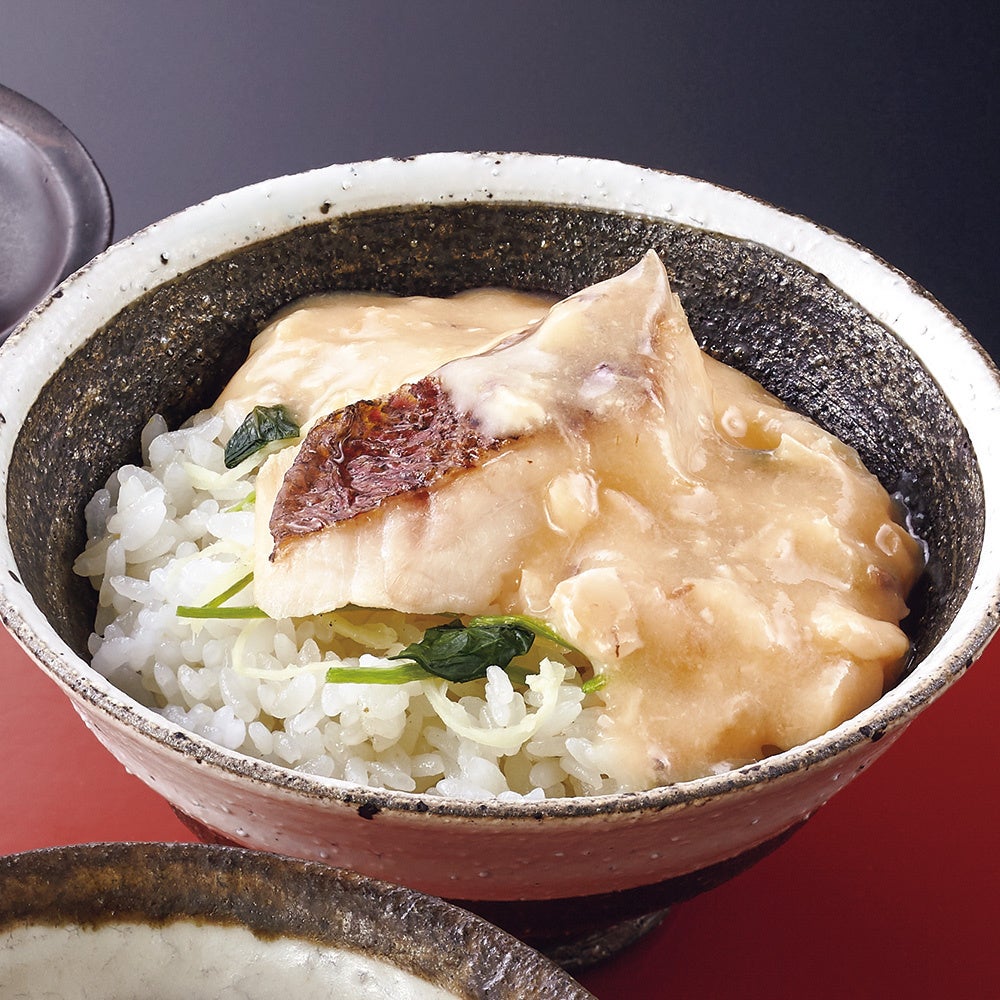 丁寧に下処理した鯛を素焼きにし、昆布出汁のきいたご飯に載せました。焼いた鯛の芳しい香りが食欲をそそります。針生姜と三つ葉の爽やかな風味や食感がアクセントに。餡にも鯛のほぐし身を入れ、風味豊かな西京味噌で上品に仕上げました。油で揚げたなすや、かぼちゃ、茹でたかぶ、大根に餡をかけても美味です。