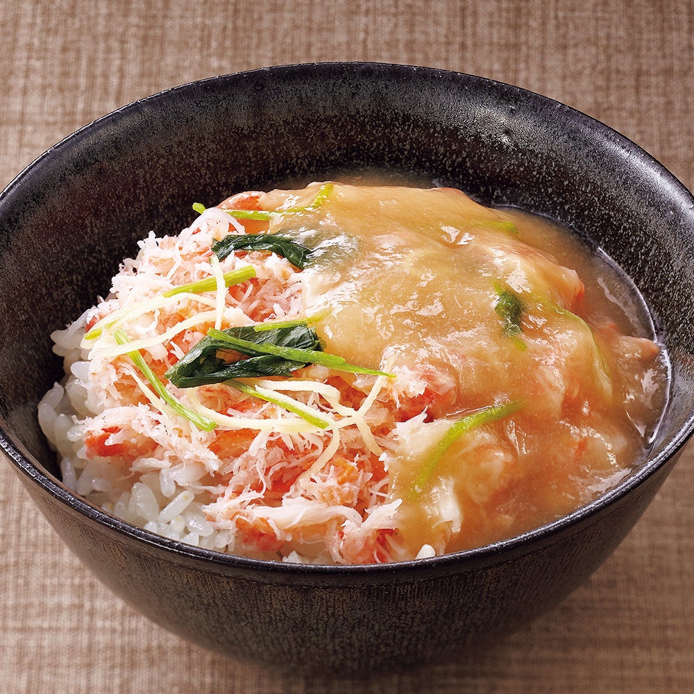 昆布出汁で炊き上げたご飯に、国産の紅ずわいがにのほぐし身をたっぷりと盛り付け、なんとも贅沢な味わいに仕上げました。三つ葉と針生姜が彩りを添え、さらに香りも豊かにしています。合わせる蟹味噌餡は、強い旨味が印象的な餡。グリルしたホタテや、竜田揚げにした鯛や鯖、風呂吹きにした大根やかぶにかけても、美味しく召し上がっていただけます。