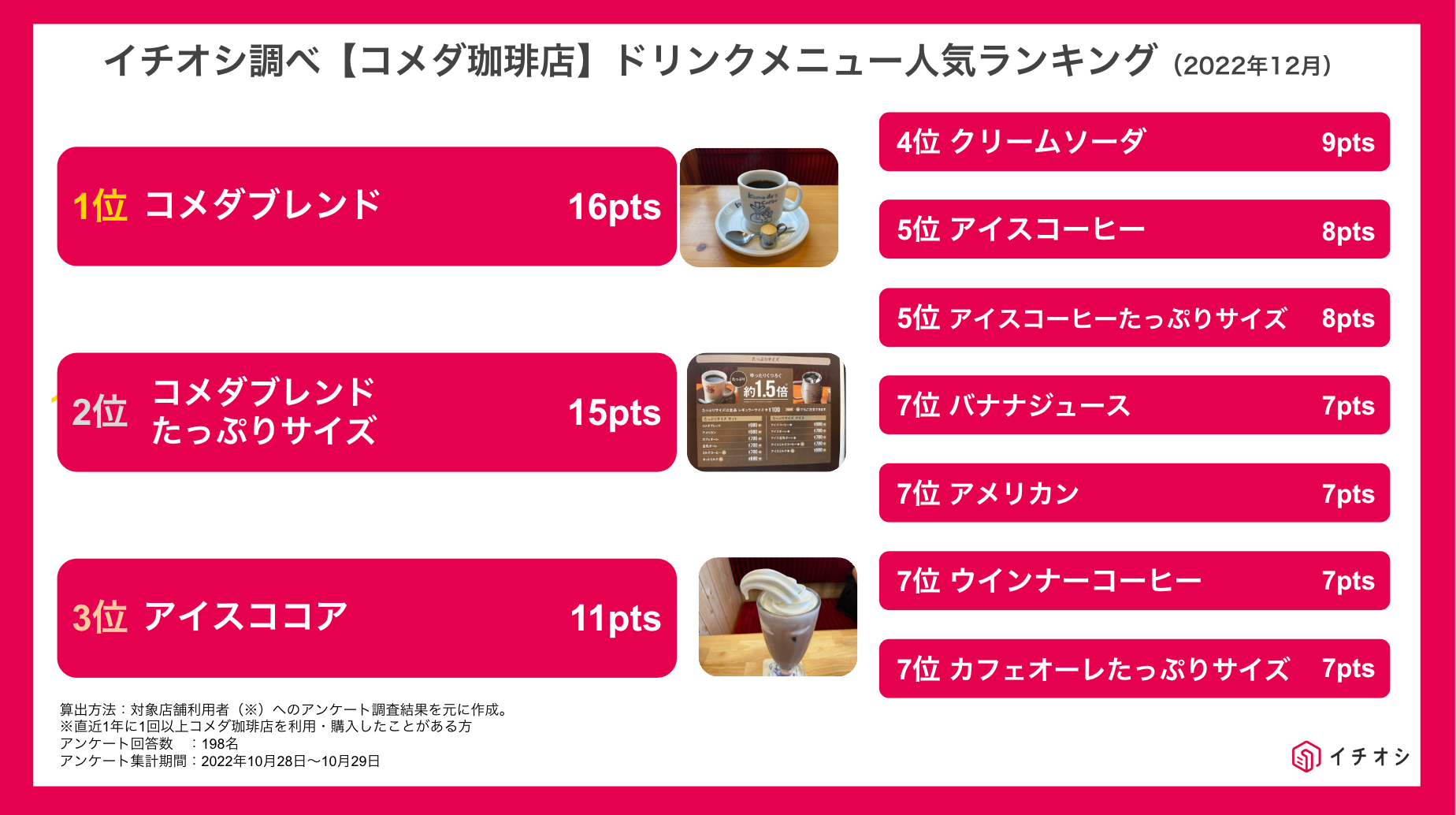 コメダ珈琲店の人気ドリンクメニュー1位に輝いたのは定番の「コメダブレンド」で、2位は「コメダブレンドたっぷりサイズ」。定番の人気商品が上位を独占しました。