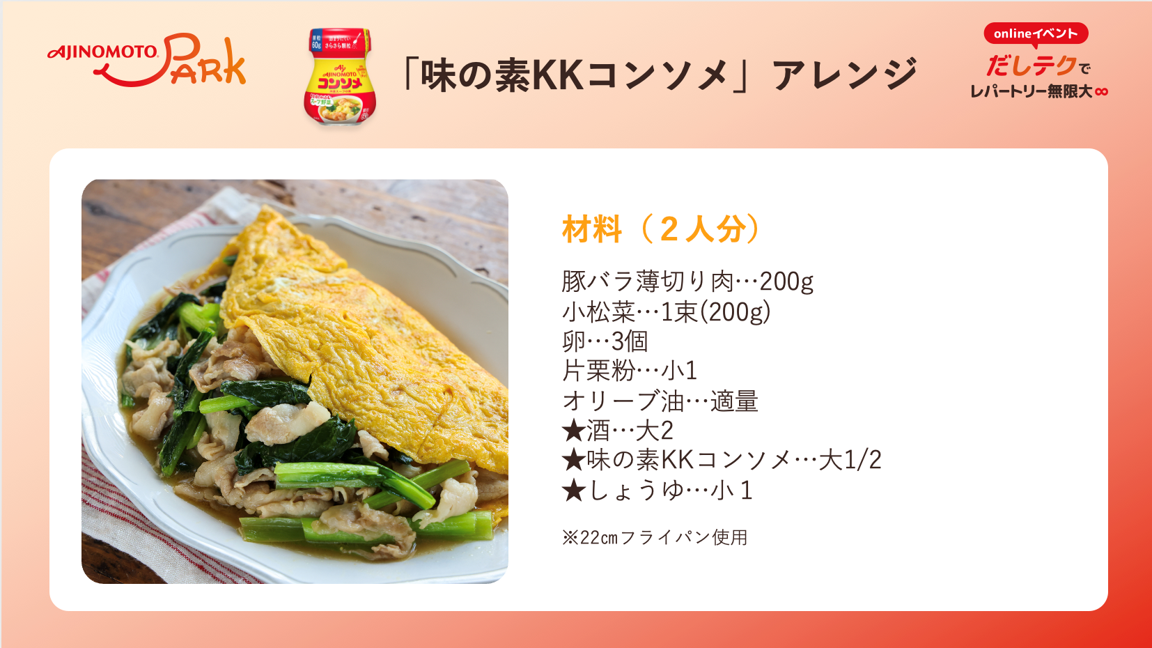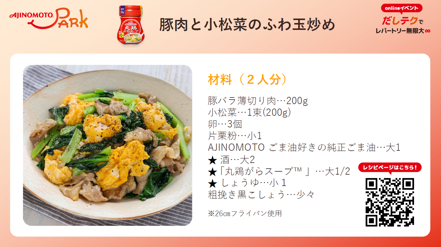 上記でご紹介した「豚⾁と⼩松菜のふわ⽟炒め」には「丸鶏がらスープ™」を使⽤しましたが、同じ材料でも調味料を「ほんだし®」や「味の素KKコンソメ」に変えると、全く違う料理に変⾝させることができます。