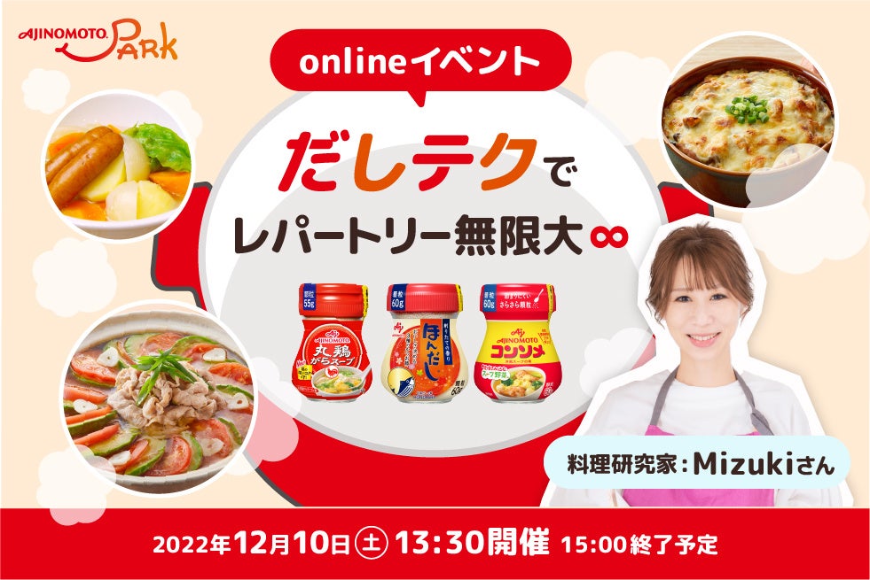 ⽇、⾵味調味料を使いこなすことで料理のレパートリーを増やし、料理をもっと楽しんでもらうことを⽬的としたオンラインイベント「『だしテク』でレパートリー無限⼤∞ 〜料理研究家Mizukiさんと学ぶ、だしの世界〜」を開催しました。