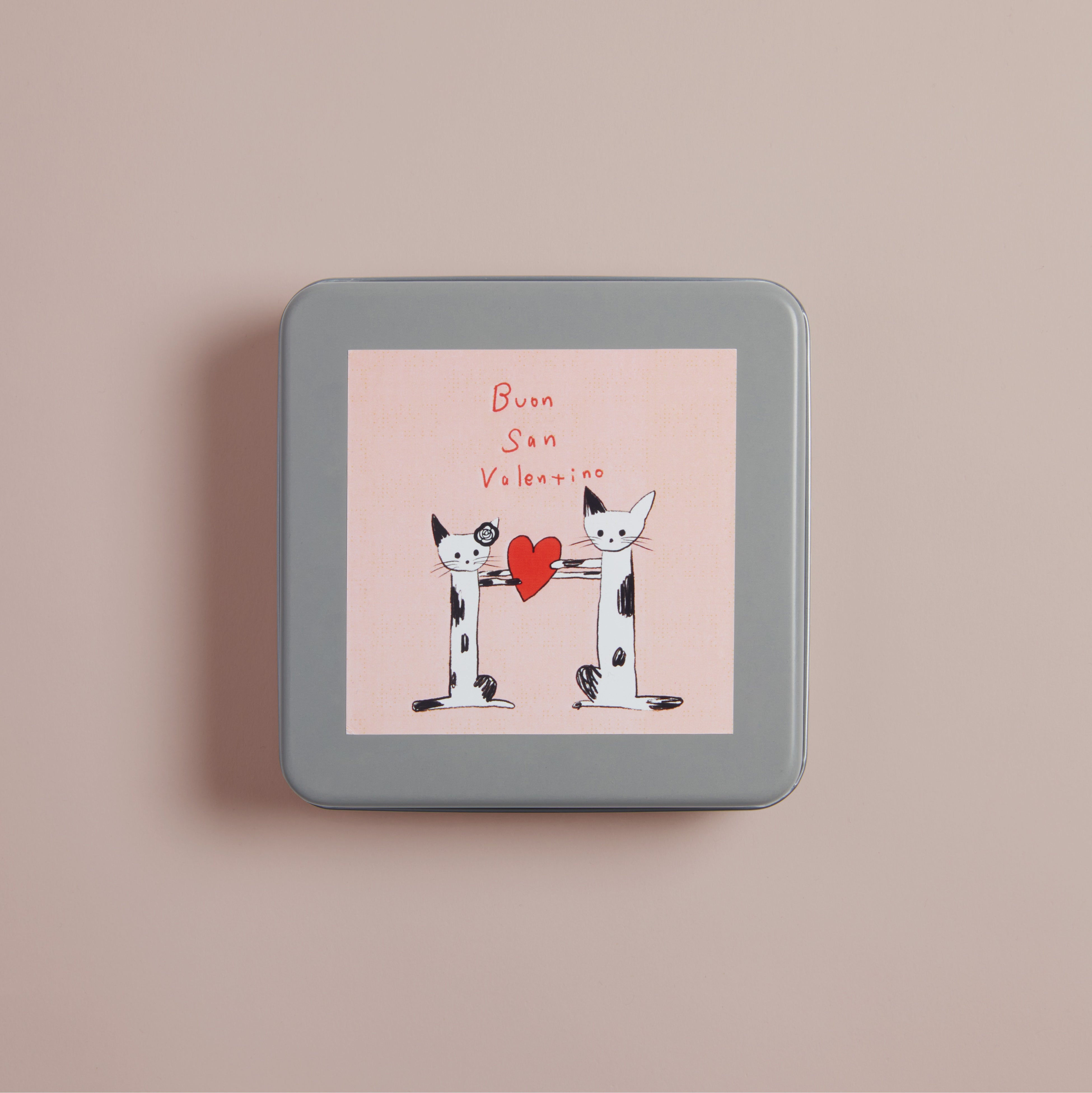 バレンタイン仕様の三毛猫クッキーの販売は今回が初めて。 三毛猫がハートをプレゼントしている様子が描かれた可愛らしいデザインのパッケージ。いつもは照れくさくて素直に言葉にできない大切な人への想いを、三毛猫クッキーと一緒に。