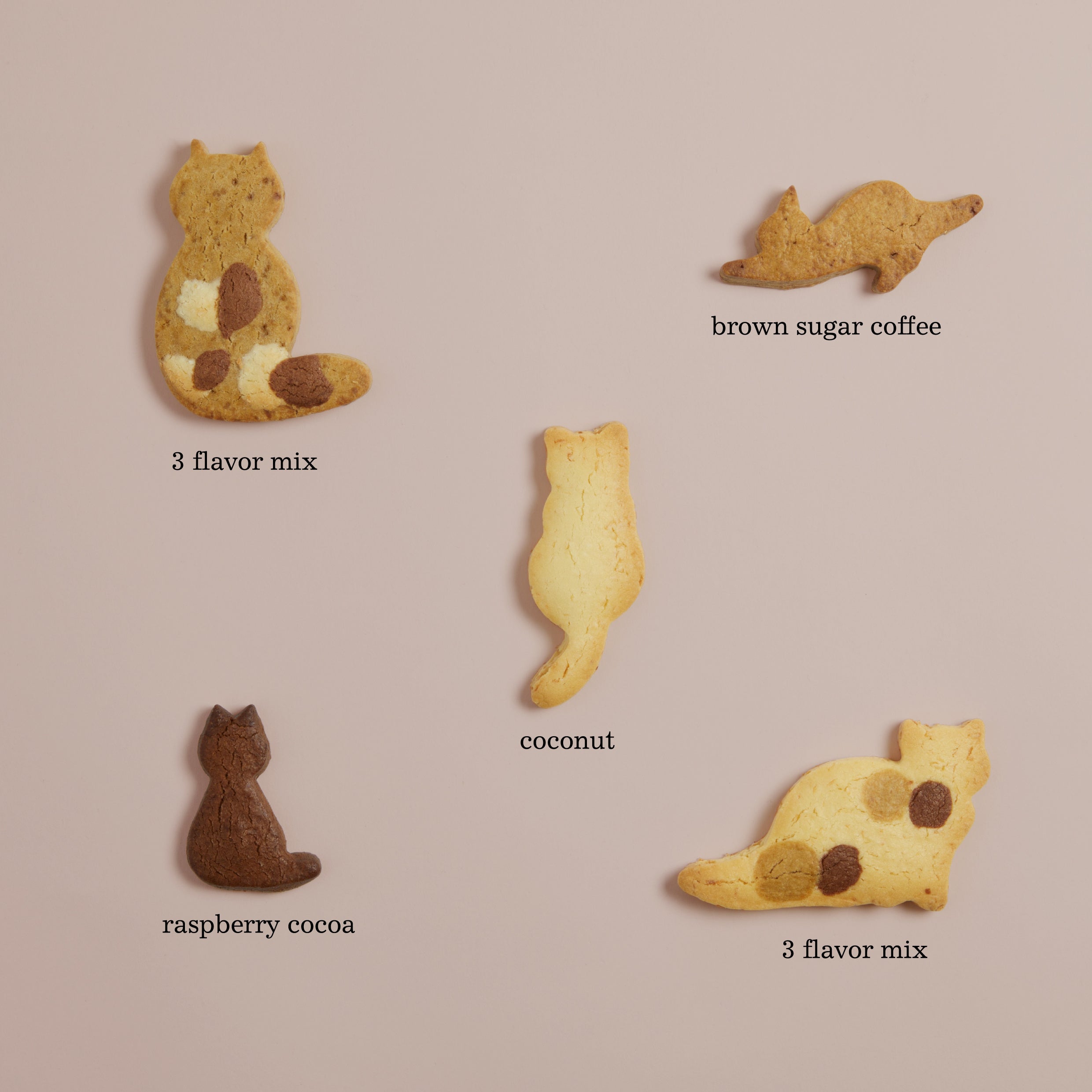 少しずつポーズの違う猫ちゃんのフレーバーは、ココナッツ・ブラウンシュガーコーヒー・ラズベリーココアの3種類。材料には厳選した国産小麦100%の薄力粉、牧草をエサとする牛のミルクから作られたグラスフェッドバター、濃厚な旨味とコクが特徴の奥久慈卵、添加物・保存料不使用の和三盆など厳選した材料を使用しています。