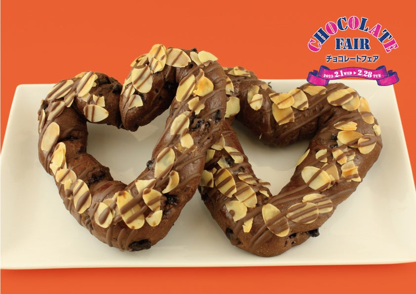 チョコレートとチップチョコを練り込んだソフトな食感のブレッド生地にチョコクリームとくるみを包み、アーモンドをトッピングしてハートの形に焼き上げました。