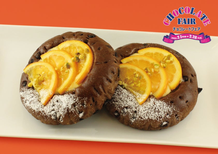 チョコレートとチップチョコを練り込んだソフトな食感のブレッド生地に、カスタードクリームとオレンジスライスをのせ焼き上げました。