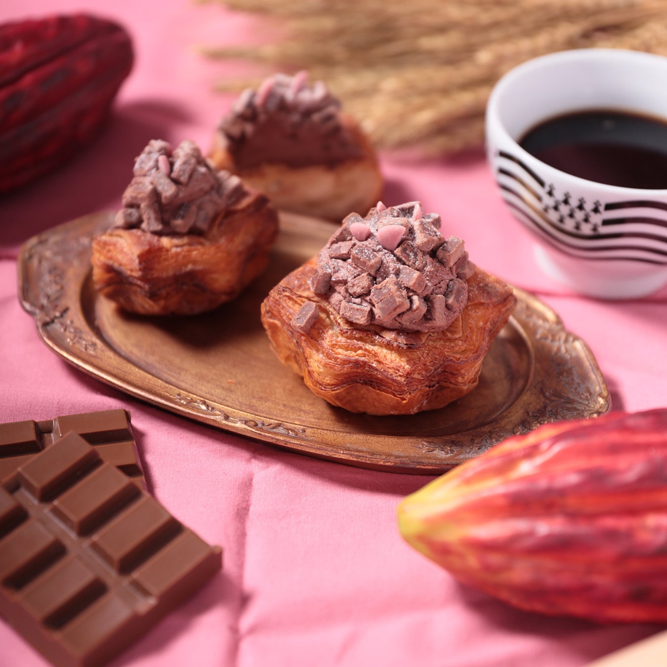 デニッシュにチョコとホワイトチョコのふたつのクリームを絞り、生チョコとルビーチョコをトッピング。