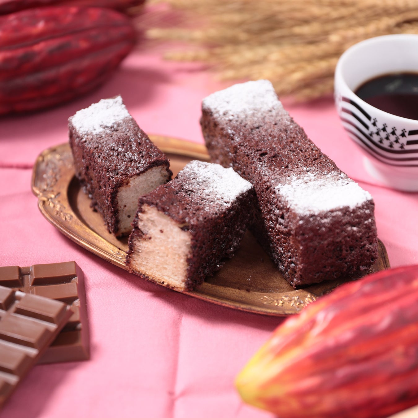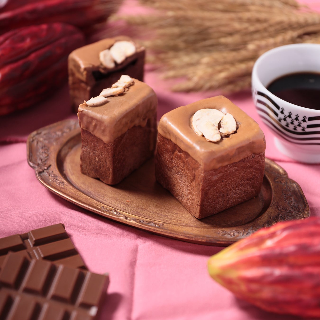 ショコラのキューブパンにビターなチョコクリームとバナナを閉じこめ、仕上げにコーヒーチョコをコーティングしました。