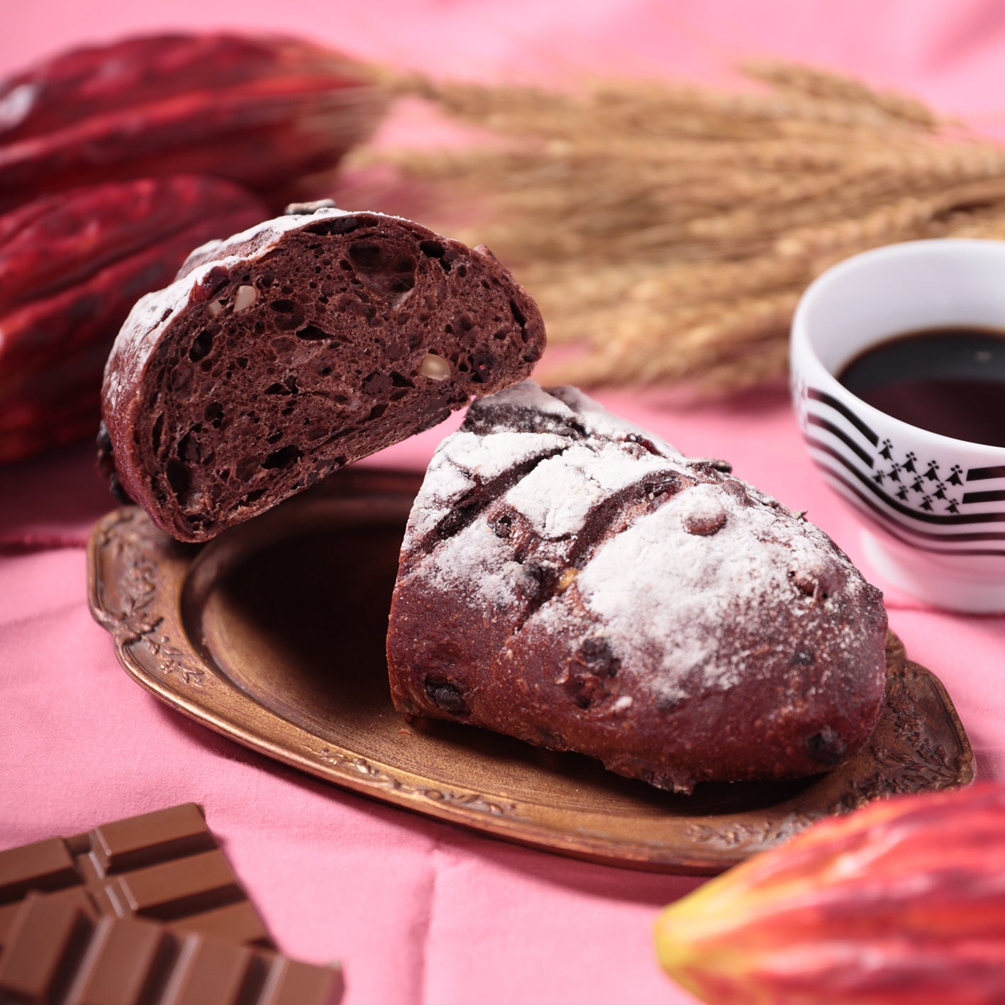 ココアを合わせたルヴァン生地にフランス産チョコレートとサワーチェリー・カシューナッツ・ホワイトチョコを入れて焼き上げました。
