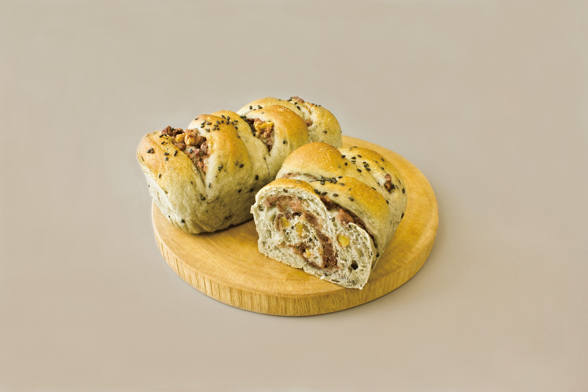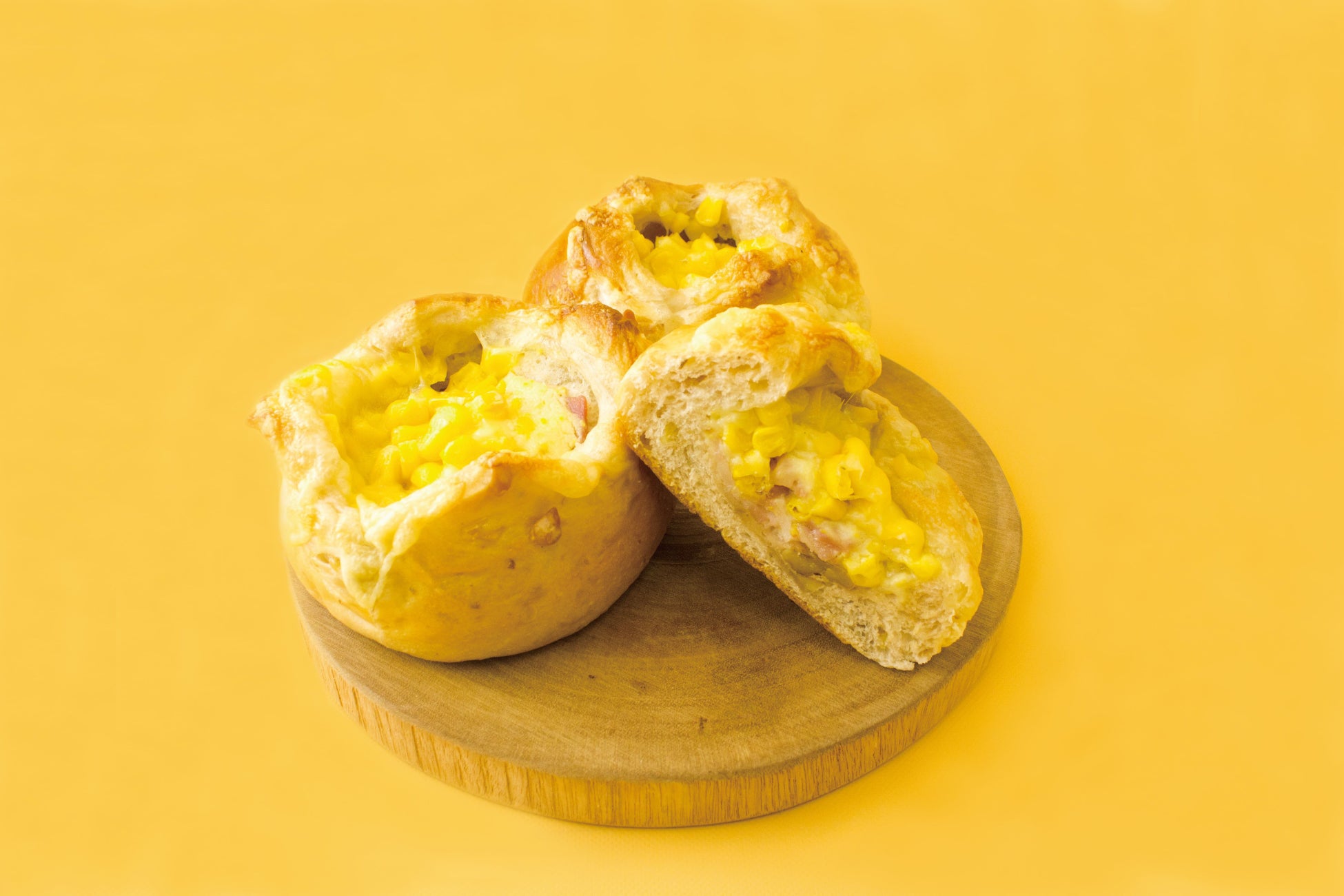スーパースイートコーンを使用したコーンフィリングとベーコンを、くるみを練り込んだ生地に包み焼き上げました。