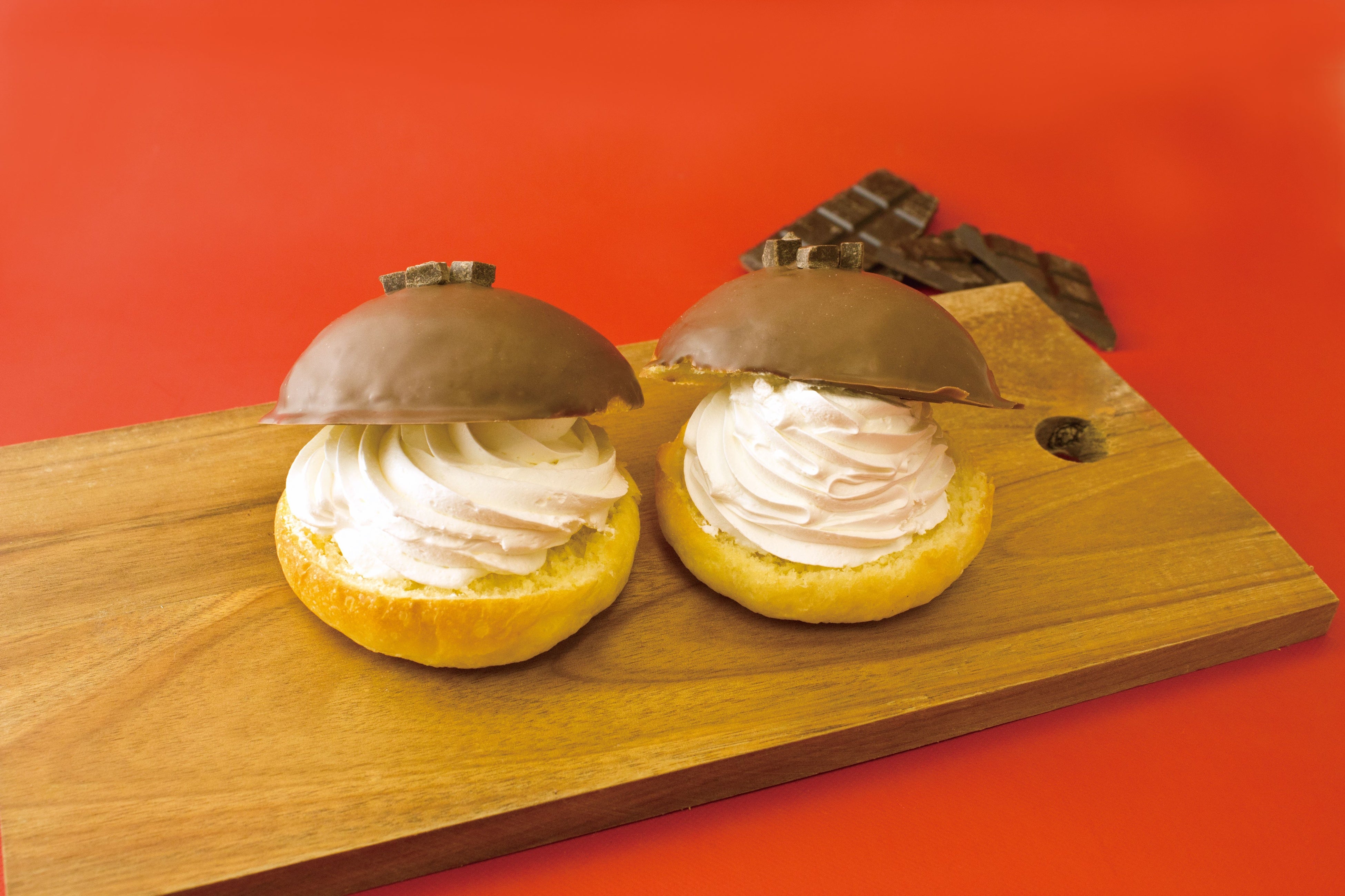 スコーン×ブリオッシュのハイブリットな生地にホイップクリームをサンドし、チョコレートをトッピングしました。
