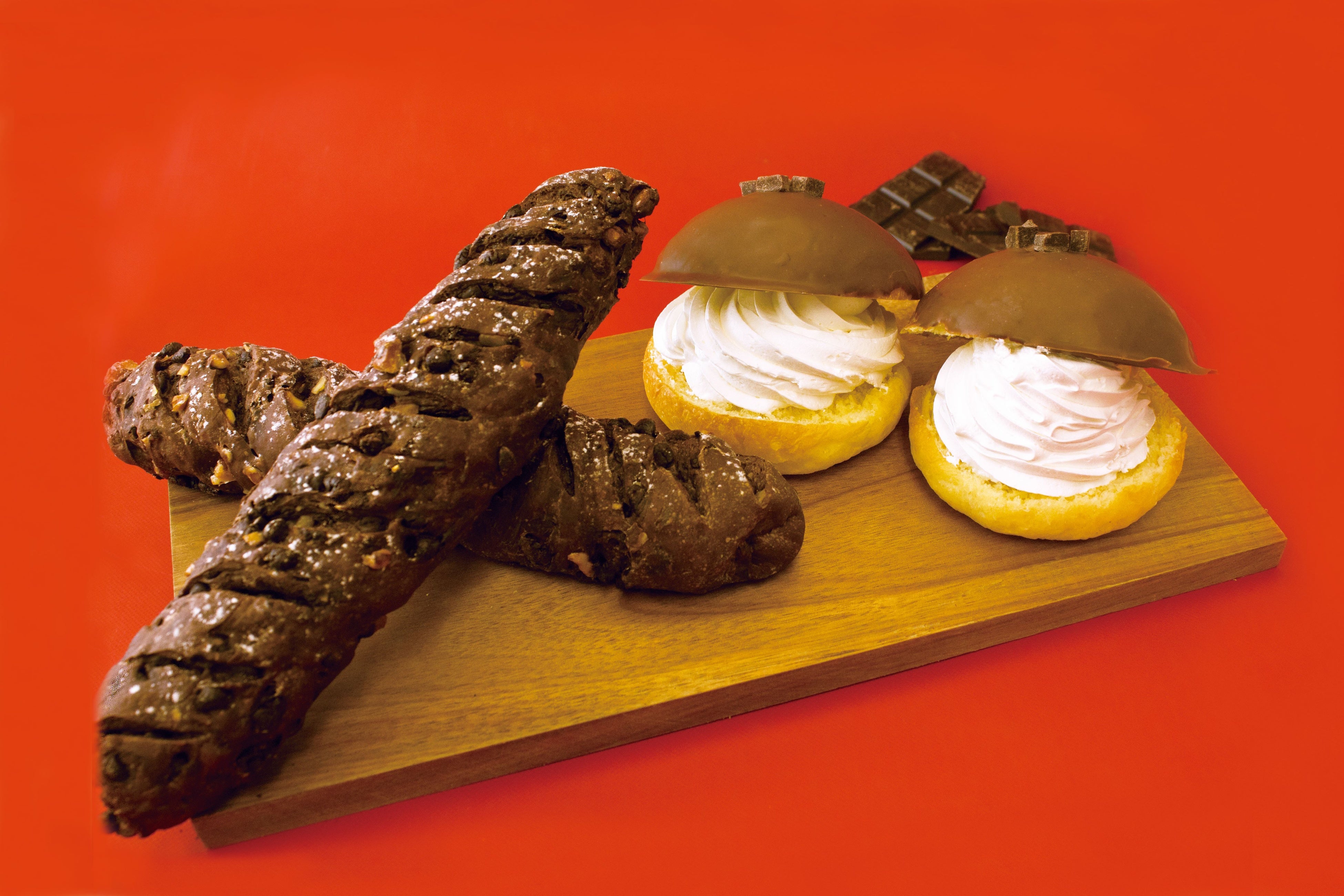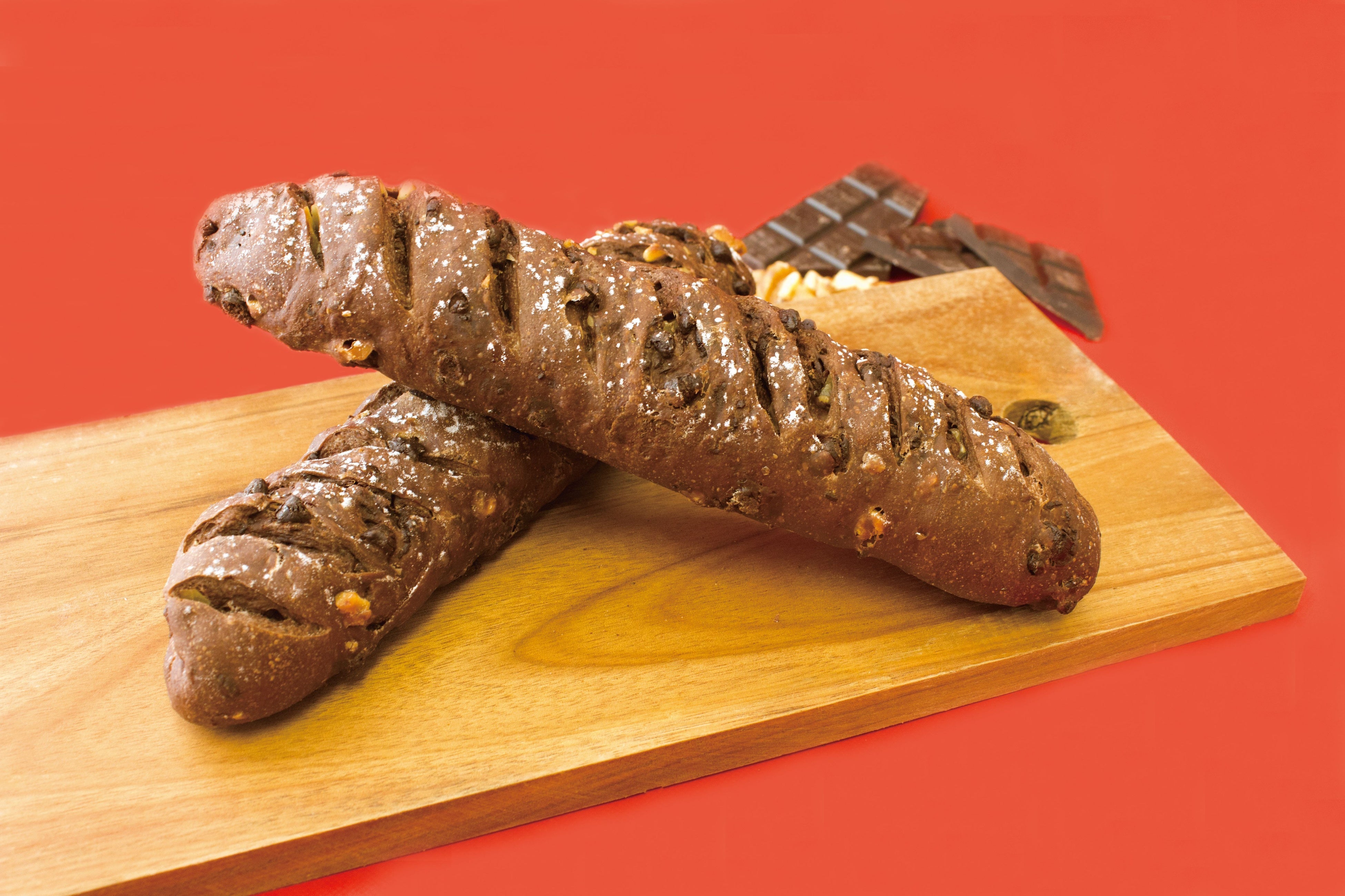 フランス産のカカオパウダーとチップチョコ、バトンチョコを使ったチョコレートづくしのクルミパンです。