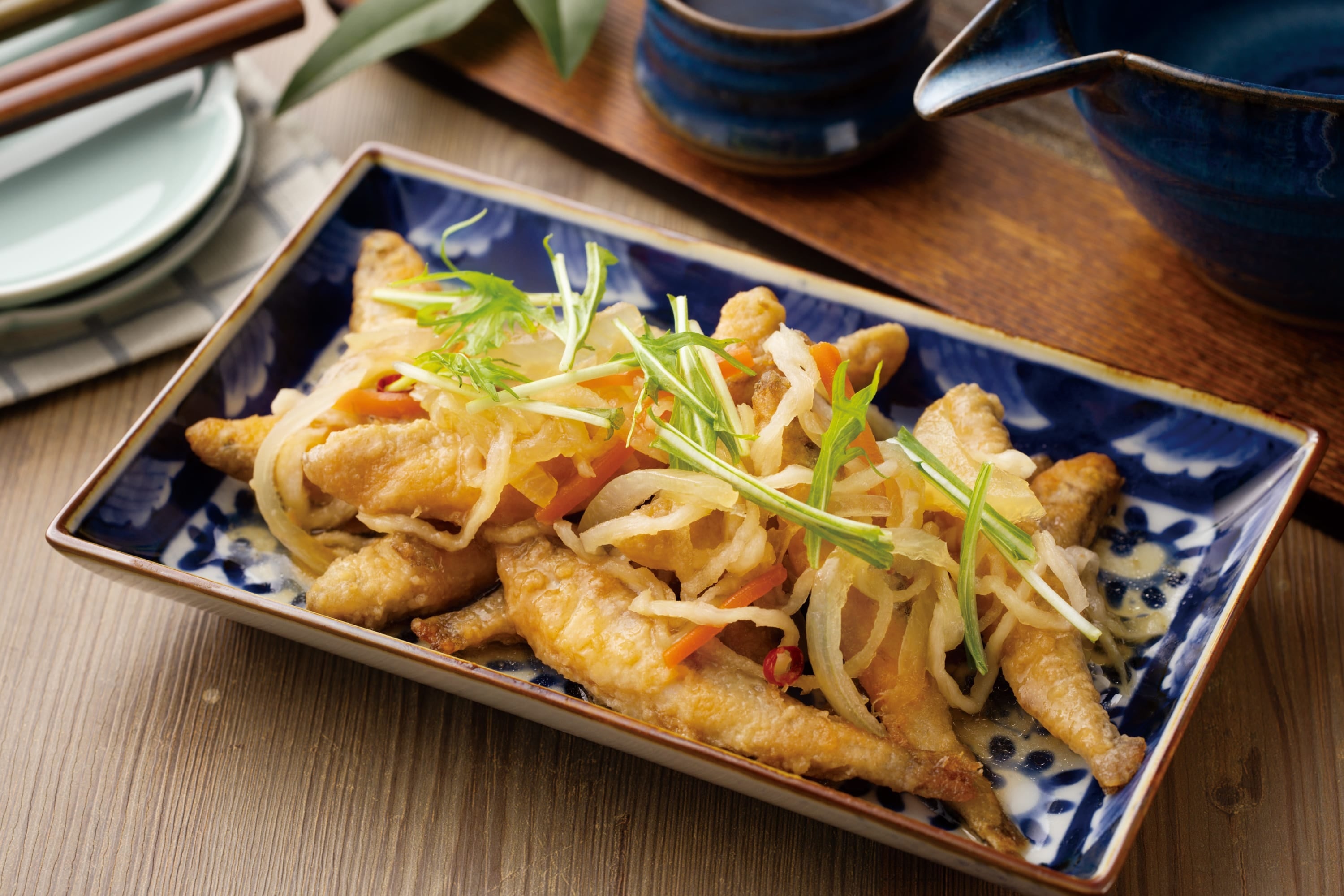 冬が旬の『わかさぎ』を玉ねぎや人参、切干大根、水菜と一緒に南蛮漬けにしました。たれの一部にはさっぱりとした紀州梅酢を使用し、サラダ感覚で野菜もしっかり召し上がれます。