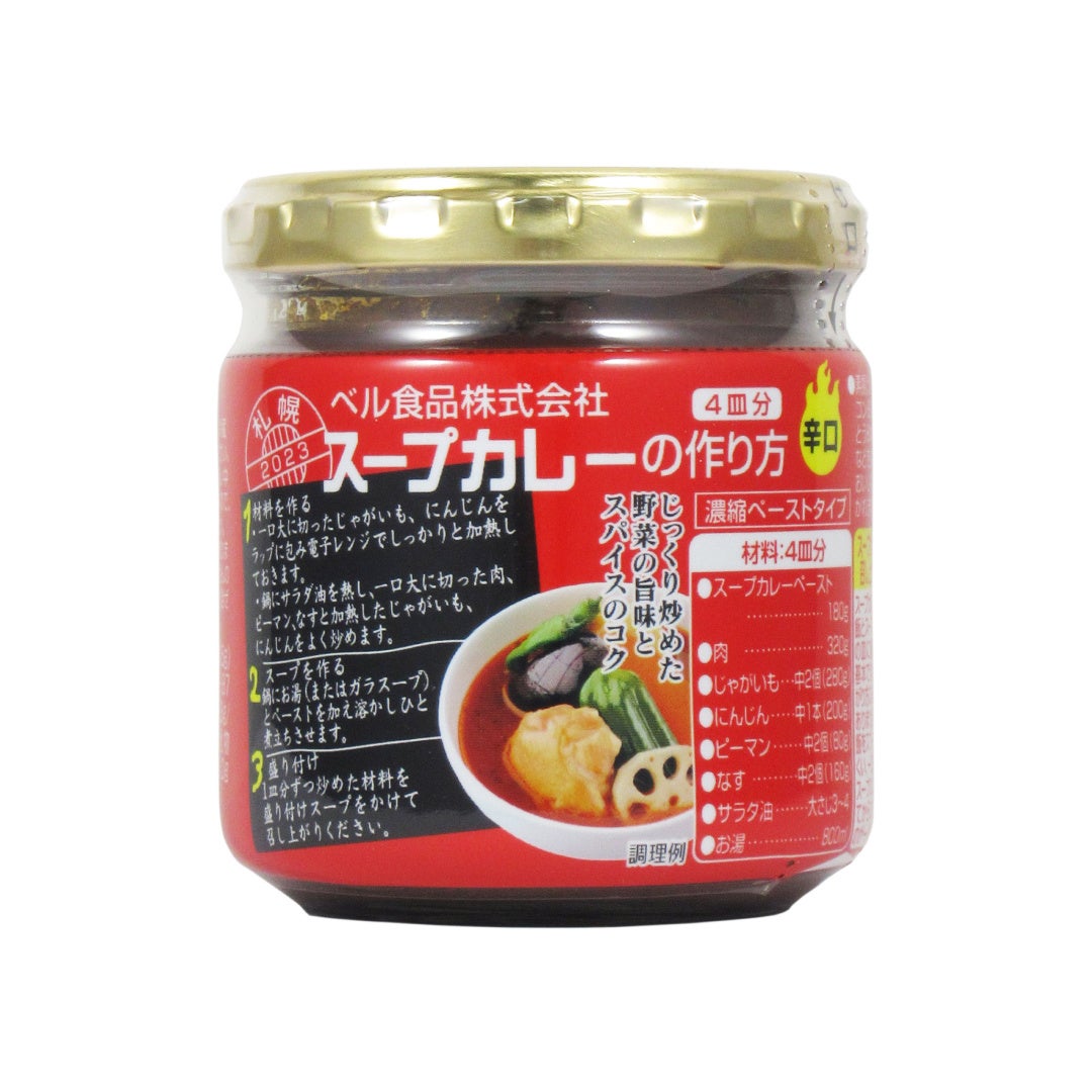 じっくり炒めた野菜とチキンの旨みに、スパイスのコクが効いた辛口のスープカレーの素で、お馴染みの瓶に辛さを強調した赤と黒のラベルが目印です。