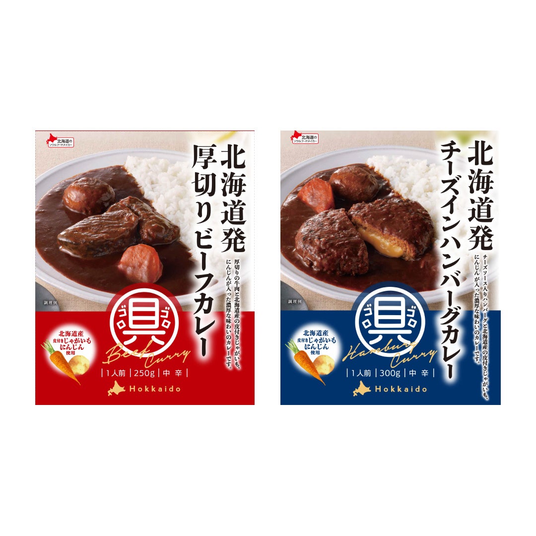昨年2022年2月に発売し、全国でご好評いただいている「北海道発カレー」シリーズの第2弾、「北海道発厚切りビーフカレー」と「北海道発チーズインハンバーグカレー」が新たにラインナップに加わります。