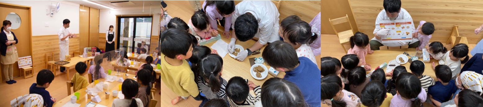 今回の食育イベントは、「1、当社のバレンタイン手作りキッド「くまちゃんクッキー」の調理実演」「2、小麦粉クッキーと米粉クッキーの食べ比べ」「3、園児による、くまちゃんクッキーの調理体験」の三部構成で実施しました。