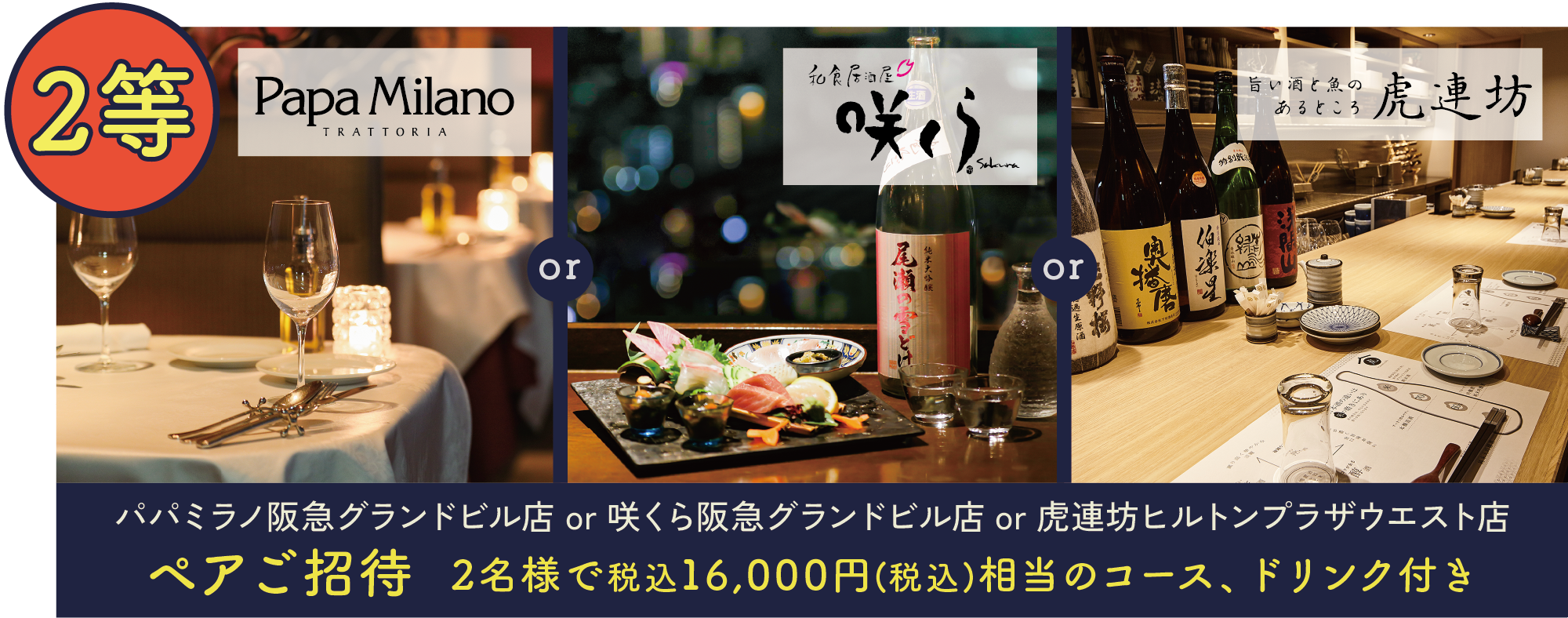 2等:パパミラノ阪急グランドビル店 or 咲くら阪急グランドビル店 or 虎連坊ヒルトンプラザウエスト店 でご利用いただけるペアご招待券(2名様で16,000円相当)