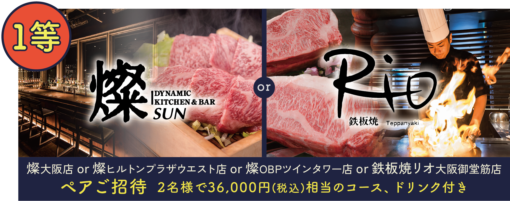 1等:燦大阪店 or 燦ヒルトンプラザウエスト店 or 燦OBPツインタワー店 or 鉄板焼リオ大阪御堂筋店 でご利用いただけるペアご招待券(2名様で36,000円相当)