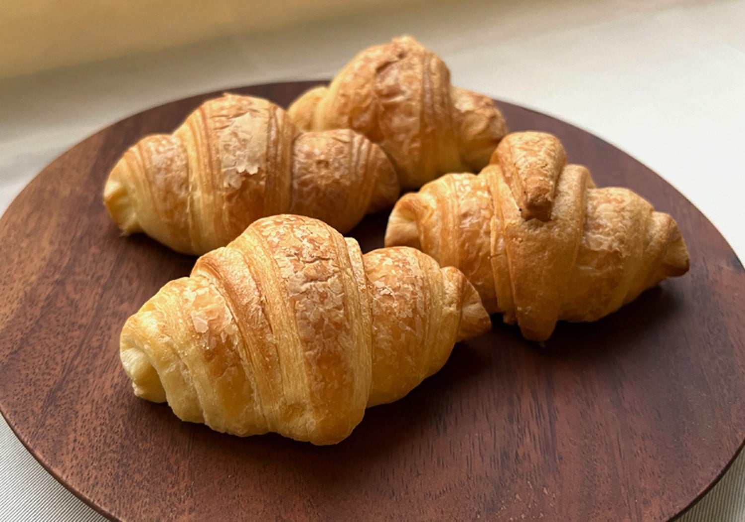 お子さまからお年寄りまで食べやすいようミニサイズにしたところ、クロワッサンへの火の通りが良くなり、サクサクとした食感がアップしました。すこし小腹が空いた時、おやつの時間などに罪悪感を持たずに食べられるクロワッサンです。