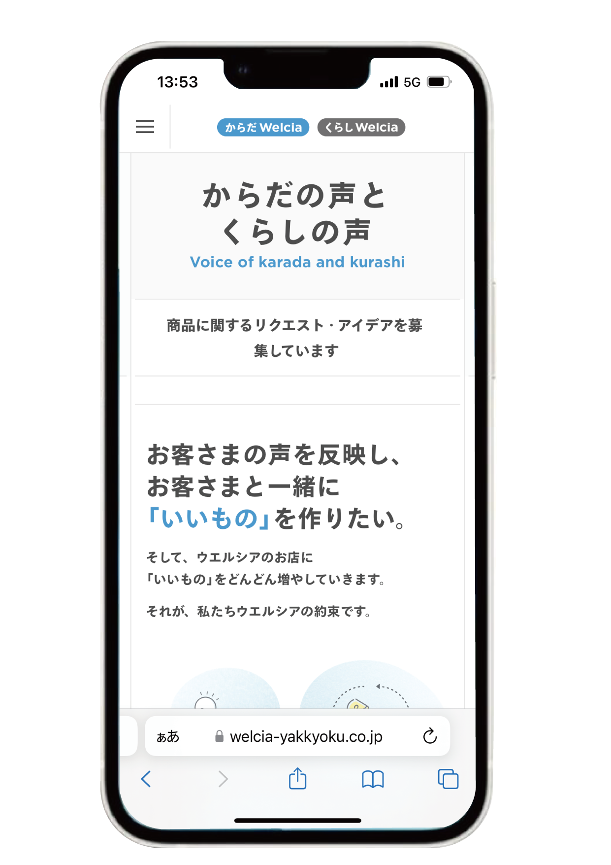からだWekcia・くらしWelciaではお客様の声をもとにした商品開発を行っており、お客様の声を募集するWEBサイト「からだの声とくらしの声(https://www.welcia-yakkyoku.co.jp/karadatokurashi/voice/ )」にてお客様の声を募集しております。