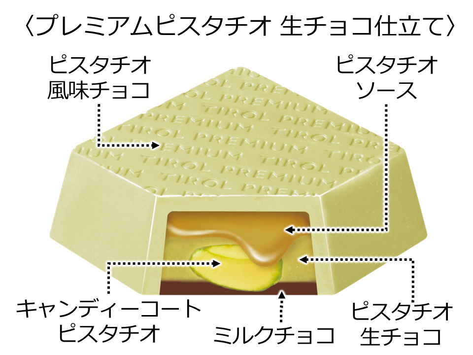 栄養価が高いことから「ナッツの女王」とも呼ばれるピスタチオが”丸ごと一粒”入った、プレミアムなチロルチョコです。ピスタチオ風味のチョコ・ソース・生チョコとキャンディーコート(飴がけ)したピスタチオで、異なる食感が楽しめます。