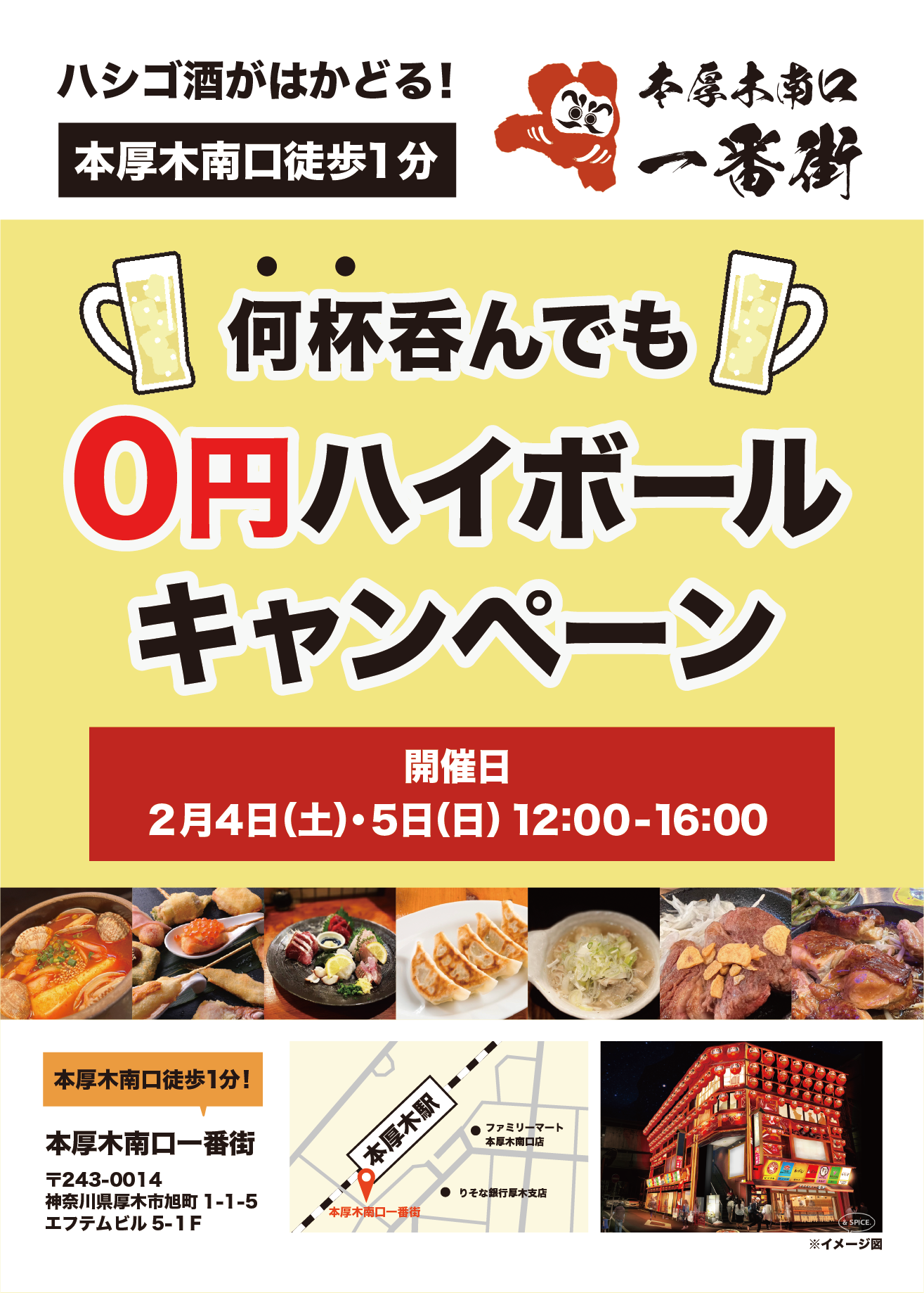 2022年1月21日にオープンした神奈川県の居酒屋7店舗が集まる「本厚木南口一番街」にて、2月4日(土)・5日(日)12:00~16:00の期間限定で「0円ハイボールキャンペーン」を開催します!