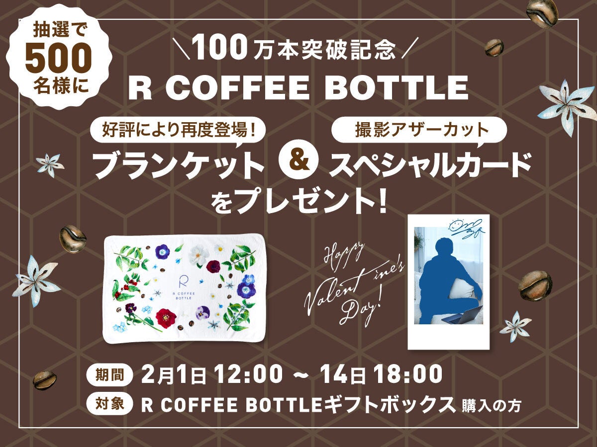 100万本突破を記念して、R COFFEE BOTTLE公式サイトにてR COFFEE BOTTLEギフトボックスを購入いただいた方の中から抽選で500名様に、発売開始時に大変好評だったR COFFEE BOTTLEオリジナルブランケットと撮影アザーカットのカードをプレゼントいたします。