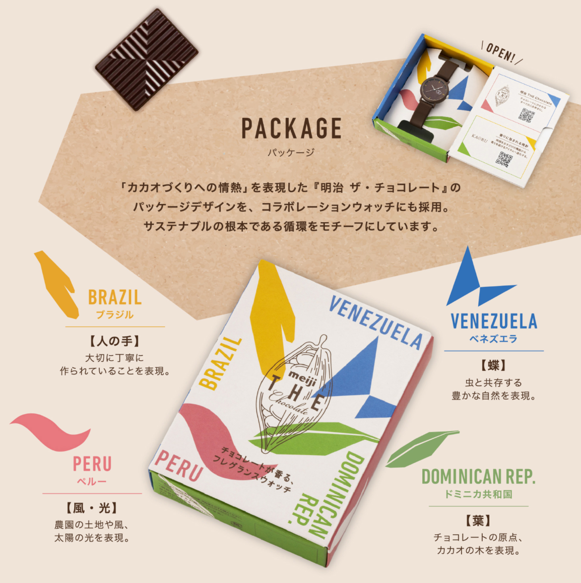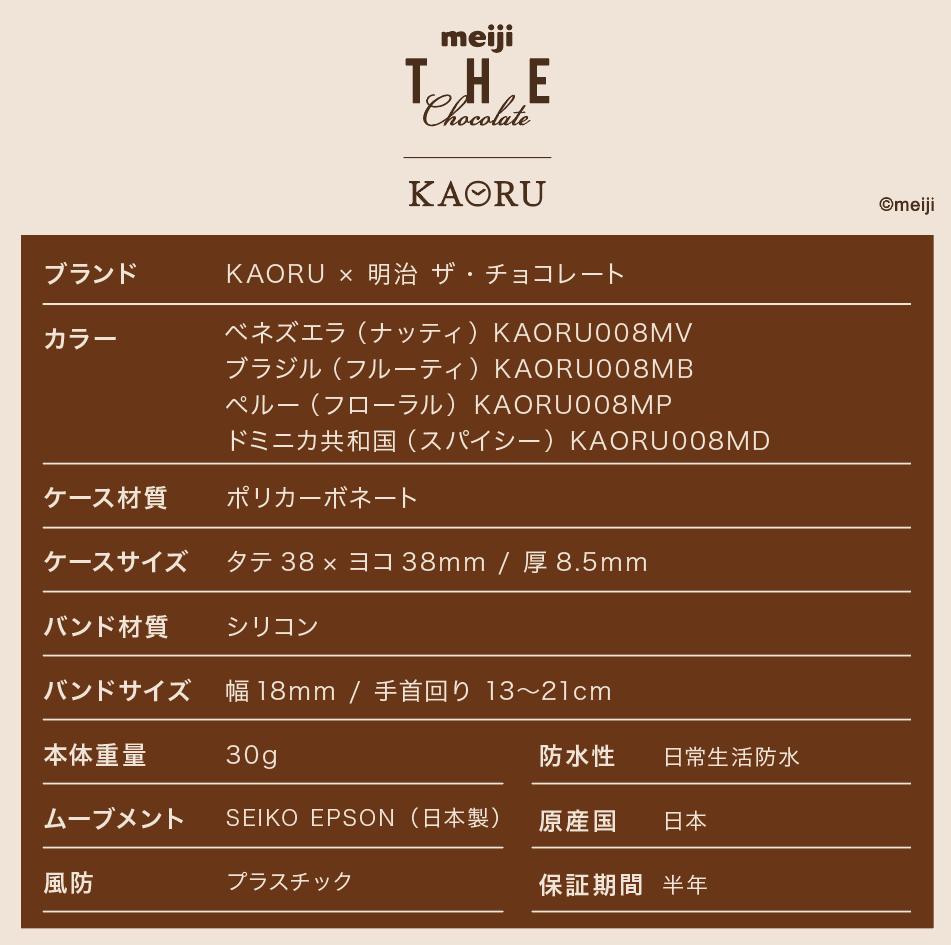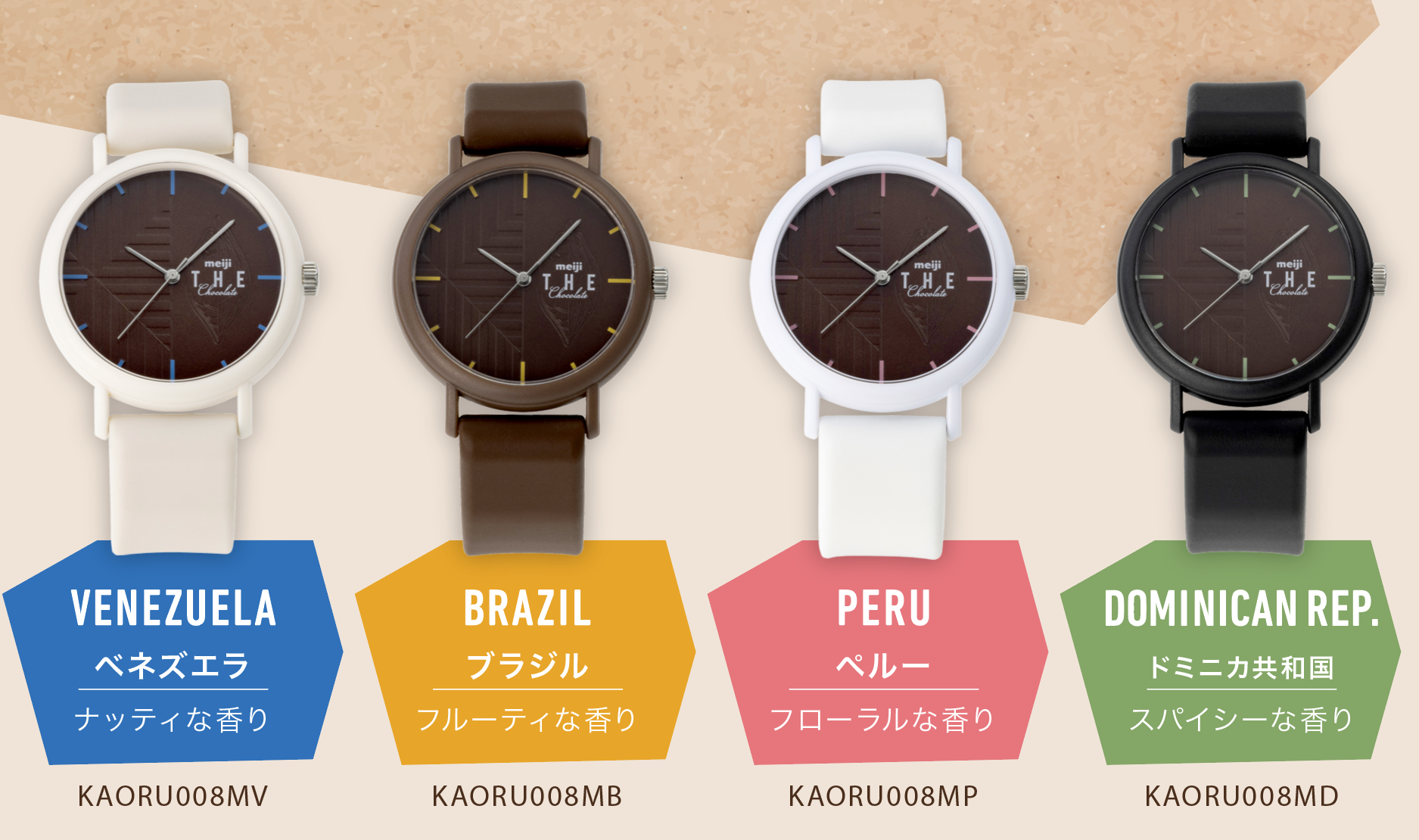 「明治 THE Chocolate」のカカオが育ったそれぞれの国へひと口で旅立たせてくれるように、「KAORU」は普段の生活に、ふとした瞬間、異国の風を感じリフレッシュ出来るファッションウォッチです。