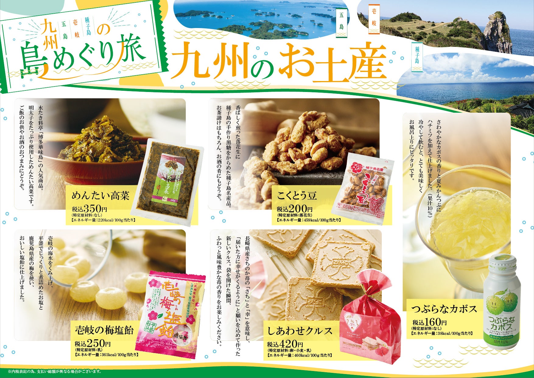 明太子をたっぷり使用した「めんたい高菜」、香ばしく煎った落花生に種子島の手作り黒糖をからめた「こくとう豆」、カボスの香りと夏みかんの粒にハチミツを加えて仕上げた「つぶらなカボス」、その他に「壱岐の梅塩飴」、長崎の「しあわせクルス」の5種類のお土産をご用意いたしました。ご自宅でも九州の旅気分を堪能できる商品を取り揃えております。