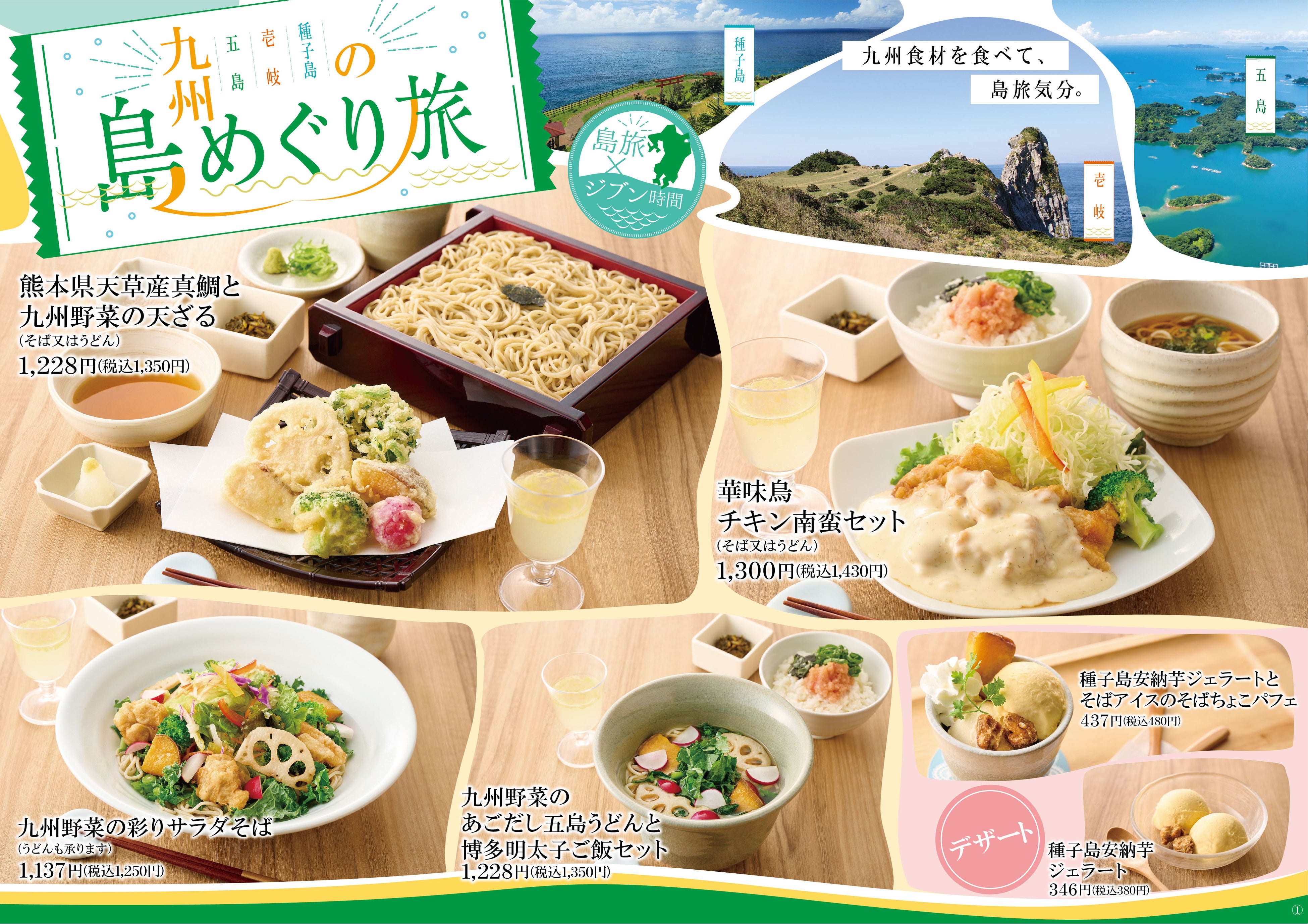 九州地方には大小さまざまな島があり、その島々でとれる食材やその島ならではの食文化が魅力の一つとなっています。家族亭では、五島列島、壱岐、種子島を中心に、九州地方の食材・食文化を使用したメニューを取り揃え、お客様に島巡り旅をしている気分を感じていただきたく、「九州 五島・壱岐・種子島 島巡り旅」を実施いたします。五島産ブロッコリー、種子島産の安納芋、その他、熊本県天草産真鯛、佐賀県産の白石れんこん、福岡県産のラディッシュ、カリーノケールを天ぷらにした天ざるそばや天丼をはじめ、九州産の華味鶏を使用したチキン南蛮、長崎県五島列島で生産されている「五島うどん」を使ったメニューなど、九州地方の魅力溢れる食材を、存分に味わっていただけるフェアとなっています。この機会にぜひ家族亭にて「九州 五島・壱岐・種子島 島巡り旅」をお楽しみください。
