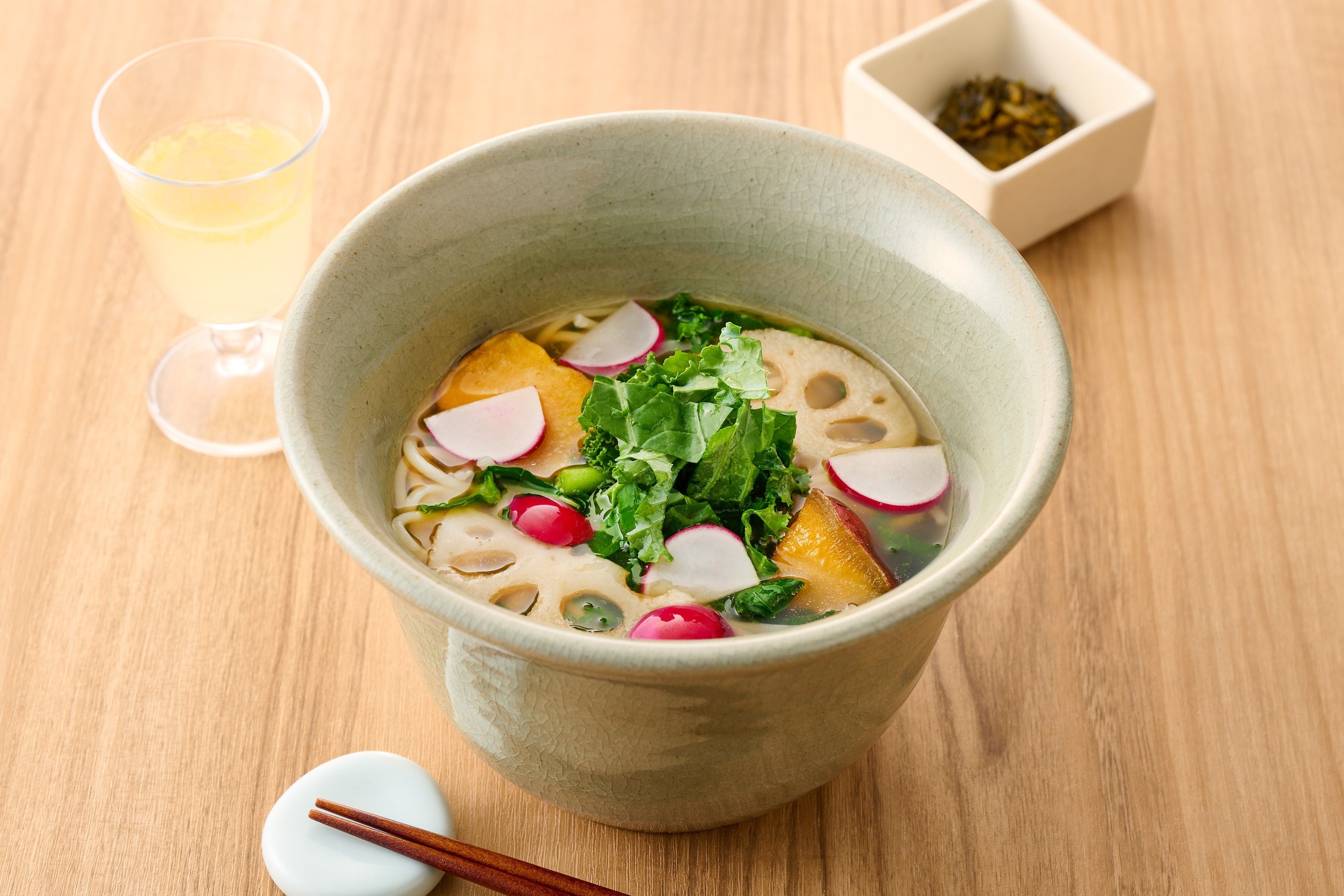 長崎県五島列島で生産されている「五島うどん」は、生地を伸ばしていく過程で、麺同士が付かないように椿からとれた椿油を使用されています。その五島うどんを旨味感じるあごだしと九州野菜を使用し、あんかけ仕立てでご用意いたしました。