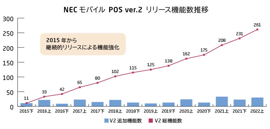 サブスク型なので、市場の変化に合わせて機能等のブラッシュアップを行います。そのため、利用企業で時間や投資コストを費やす必要がありません。また、NECモバイルPOSを導入している1,300社の利用企業からのニーズに声を傾けてバージョンアップを行っているため、個々の利用企業が新たな機能の必要性に気づいた時には、すでにその機能を盛り込んだ機能が実装済みとなっていることが多いです。