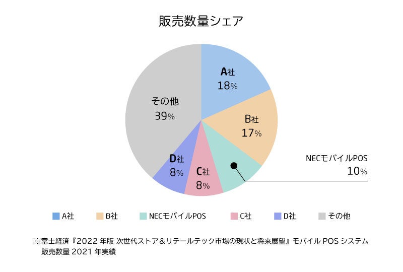 富士経済の『次世代ストア&リテールテック市場の現状と将来展望 2022年版』の調査データによると「NECモバイルPOS」はサブスクリプション型のタブレットPOSでは全体の10%を占め、シェアで3位(※)となっています。