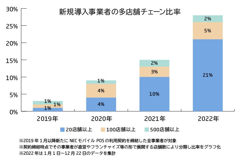 2021年5月に1,000社導入を達成して以降、2022年6月には1,200社、同年12月には1,300社達成と、直近の約半年で新たに100社が「NECモバイルPOS『サブスク型POS』」を導入しました。