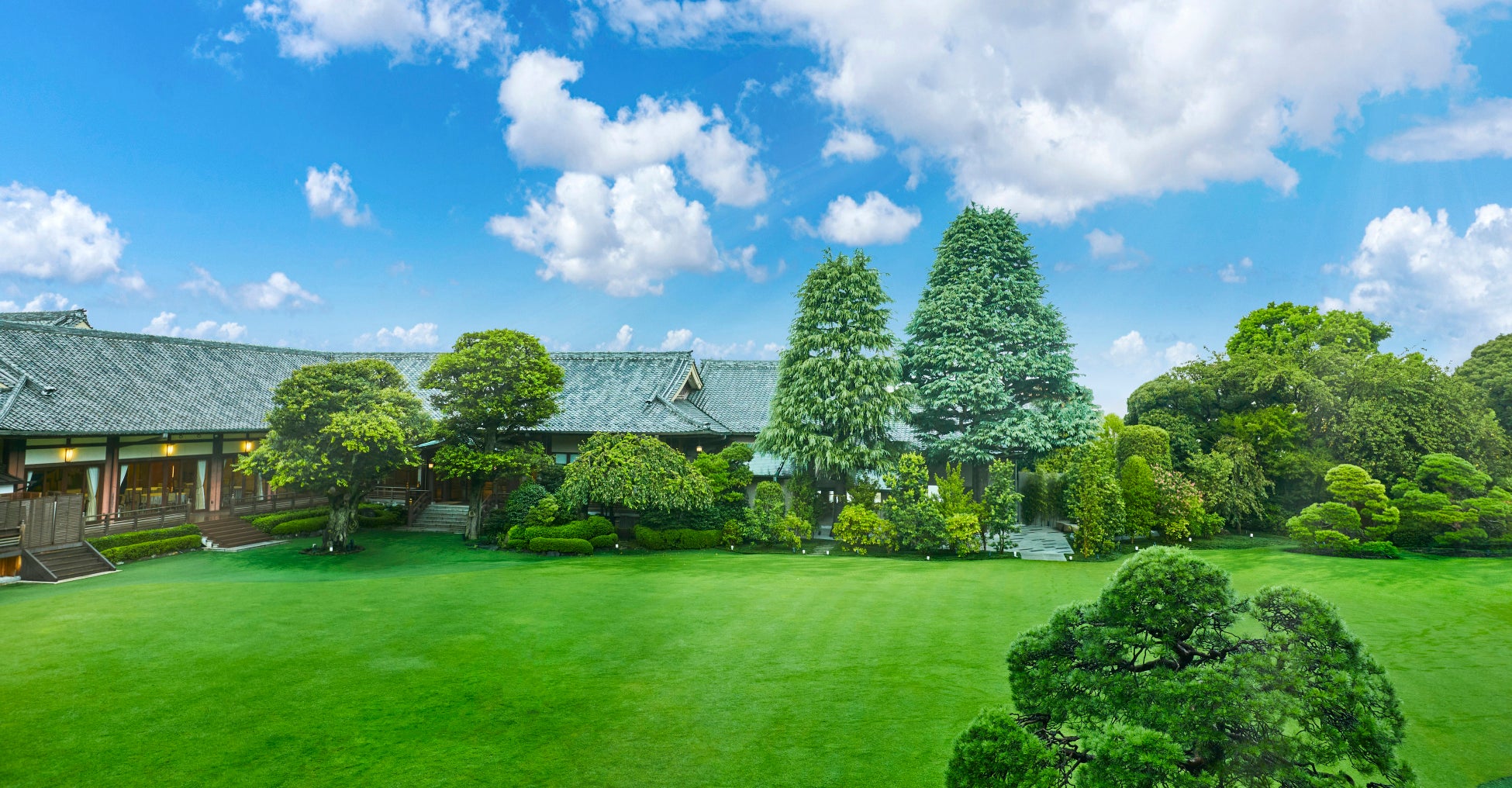 明治14年、当時の⾚坂仮皇居の御会⾷所(⽇本で初めての迎賓館)として今の迎賓館のある場所に建てられたのが、現在の明治記念館本館(憲法記念館)です。明治21年、⼤⽇本帝国憲法草案審議の御前会議も開かれました。その後、明治神宮外苑の一角に移築され昭和22年に明治記念館として開館しました。現在ではユニークベニューとしてのMICE案件や、ウエディング会場として利用されています。令和2年には歴史的・建築的価値が認められ本館が東京都指定有形⽂化財(建物)に指定されました。