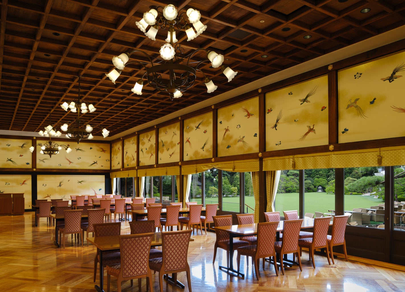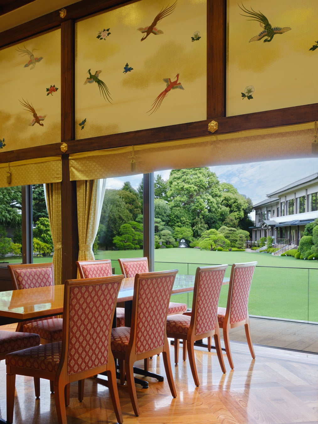四季折々の花や緑が季節を織りなす庭園に面した開放的なラウンジ。壁一面に金鶏が舞い、部屋の中央には堂々とした漆塗りのマントルピース。赤坂仮皇居御会食所をそのままに、明治時代の面影を残す格天井など歴史あるインテリアが上質な時間を紡ぎます。