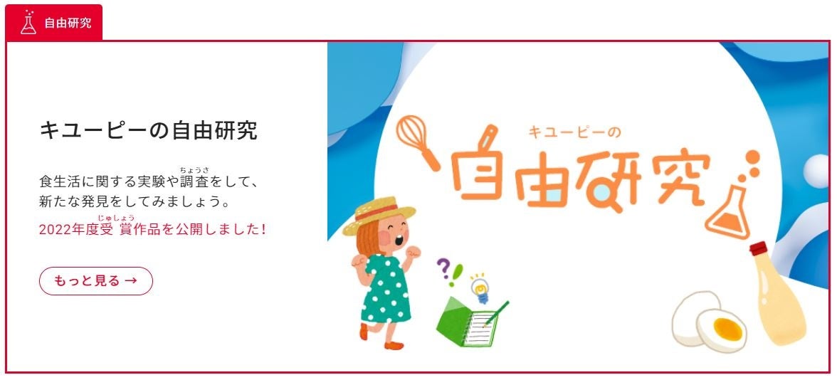 | キユーピー食生活アカデミー 『食生活アカデミー』は、小学校高学年から中学生を対象に、未来を創る子どもたちが、食の知識や体験を通して生活を豊かにし、新たな関心や興味につなげ、将来に役立ててほしいという思いで制作した食育のためのコンテンツです。今後も随時情報を追加し内容を充実させていきます。 |