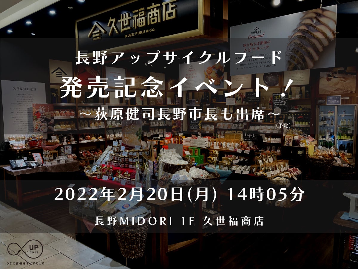 2023年2月20日(月)、長野市の「MIDORI長野店」内、久世福商店にて、長野アップサイクルフード第一弾商品として同日発売される缶詰の発売記念イベントを以下の内容にて開催します。長野発の商品開発プロジェクトとして共に取り組んできた、長野市の産学官金の連携組織「NAGANOスマートシティコミッション(NASC)」の会長を務める、荻原健司・長野市長にもお越しいただき、長野市発のアップサイクル商品を店頭でお披露目いたします。ぜひ当日会場での取材をご検討いただきたく、以下その詳細をお知らせいたします。