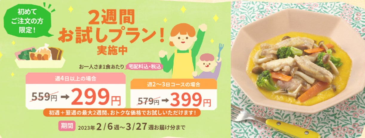 これから「PAKU MOGU」を始める方は、週4日以上のご注文でお1人さま1食あたり299円よりご注文できる「2週間お試しプラン」をご利用いただけます。初週+翌週の最大2週間、おトクな価格でお試しいただけますので、ぜひこの機会にご利用ください。