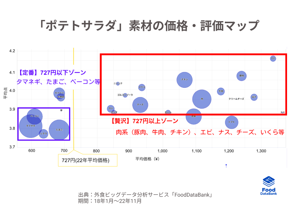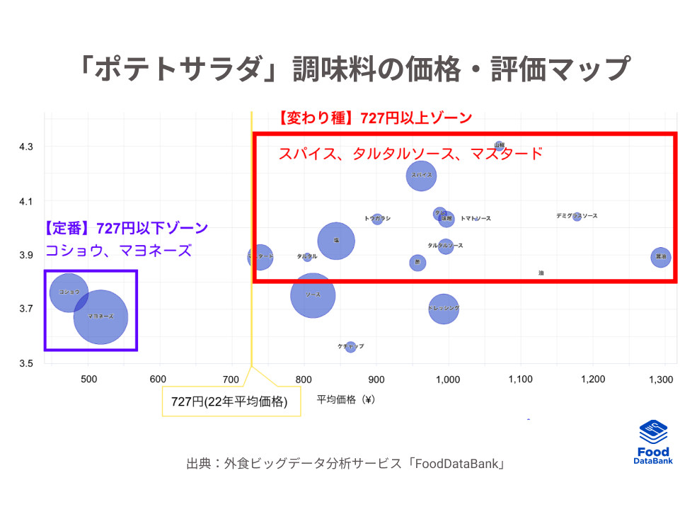 調味料に関しても、コショウ、マヨネーズといった定番のポテトサラダに使用される調味料より、スパイス、タルタルソース、マスタードといった平均価格(727円)以上の変わり種調味料を使用したポテトサラダの評価が高い傾向にあることが分かりました。定番ポテトサラダも安定した評価のある一皿ですが、プラス@を感じることのできるポテトサラダは更に評価が高くなりやすいのかもしれません。