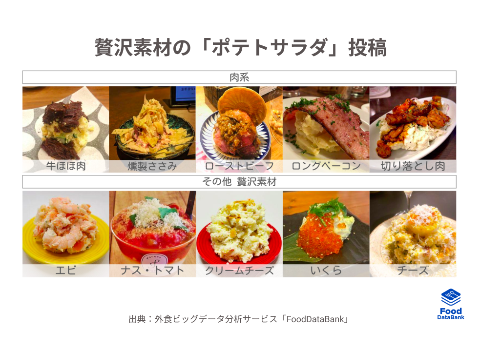 「ポテトサラダ」の素材に関する価格・評価マップをみると、肉系(豚肉、牛肉、チキン)やエビ、ナス、チーズ、いくら、といった平均価格(727円)以上の贅沢素材は、タマネギ、ベーコン、たまごといった定番素材の平均点より高い傾向にありました。投稿画像からも表面を肉で覆ったポテトサラダや、たっぷりと使用されたエビなど、贅沢素材が際立つビジュアルのポテトサラダが人気の傾向にあるようです。