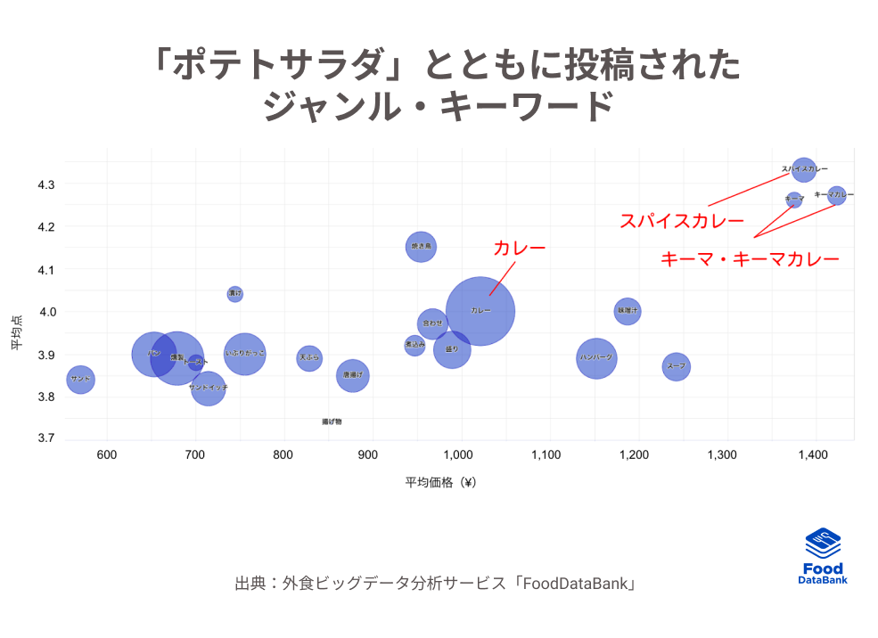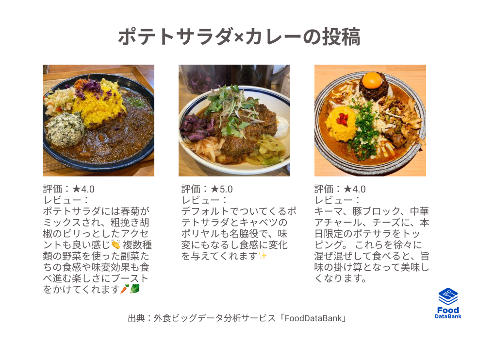 ポテトサラダは洋食や定食の付け合わせとして登場することが多い印象ですが、トッピングという形でカレーと組み合わせても食べられており、その平均点は高い傾向にあることが分りました。ポテトサラダをトッピングすることで箸休めになったり、カレーと混ぜて食べることで味変できたりする点が求められているのかもしれません。