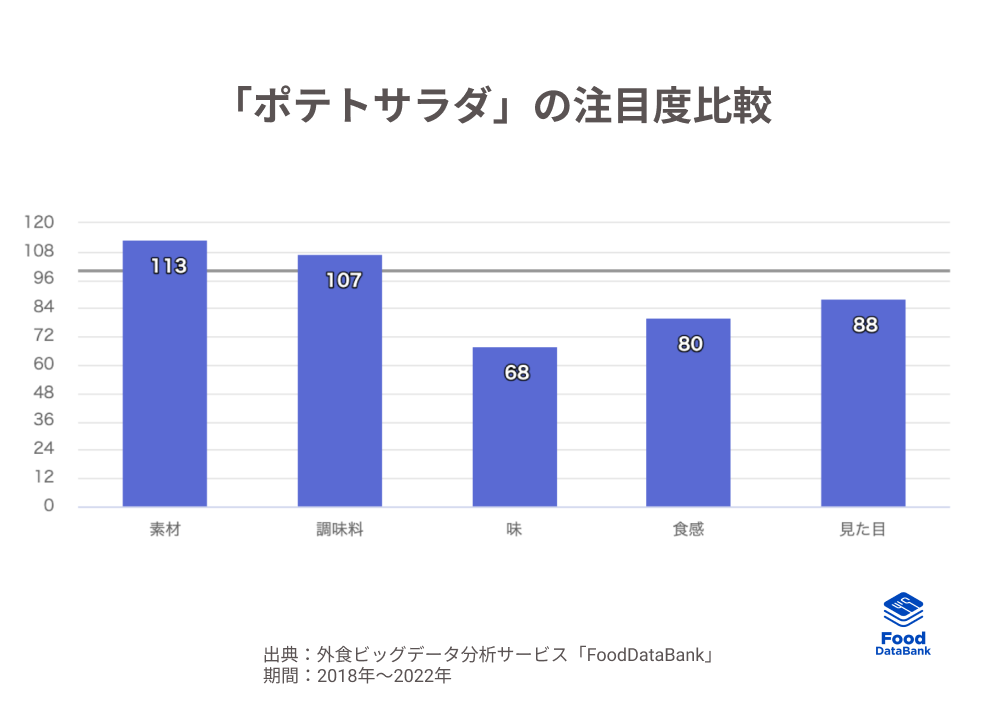 外食ビッグデータ分析サービス「FoodDataBank」から、ポテトサラダの直近5年間の平均価格を比較すると、2022年が727円と最も価格が高くなっていることが分りました。原材料費の高騰の影響も考えられますが、ポテトサラダに関してはそれ以前から平均価格が上昇していることが見て取れます。